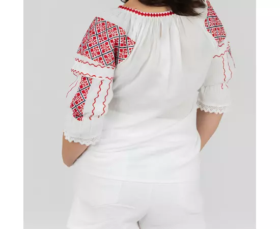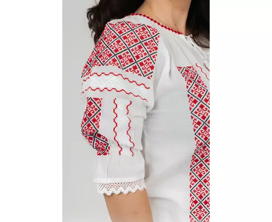 Bluza Tip Ie Traditionala Alba cu Motiv Geometric Rosu de Dama - IMS139