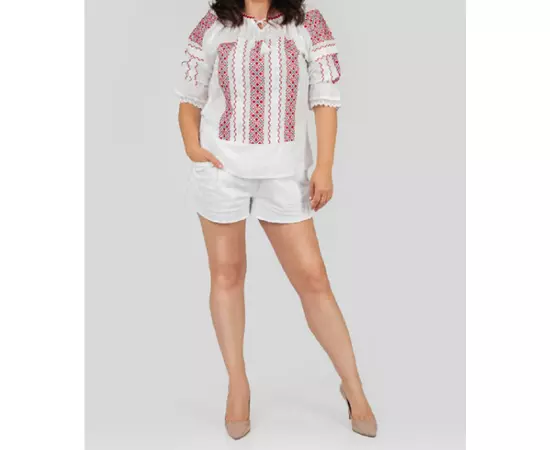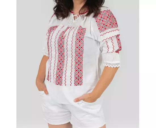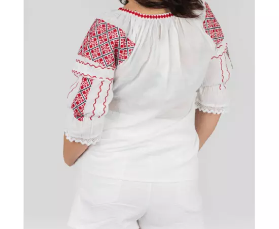Bluza Tip Ie Traditionala Alba cu Motiv Geometric Rosu de Dama - IMS139