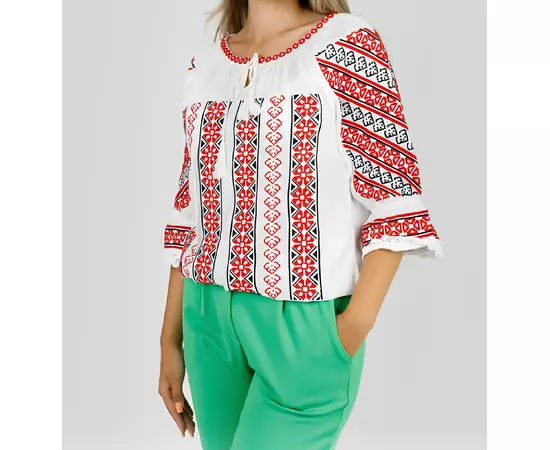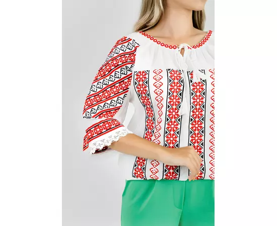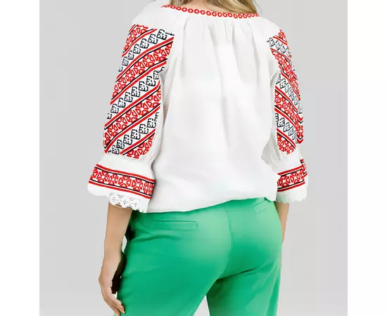 Bluza Tip Ie Traditionala Alba cu Motiv Geometric Rosu de Dama - IMS159