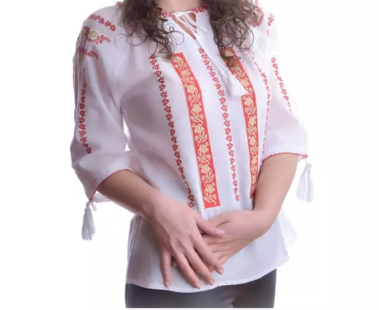 Bluza Tip Ie Traditionala Alba cu Motiv Geometric Rosu de Dama - IMS71