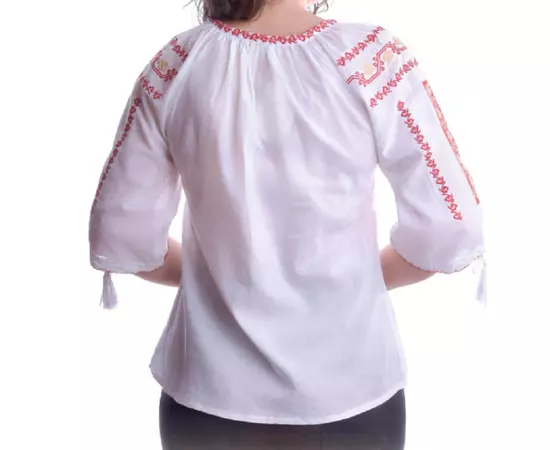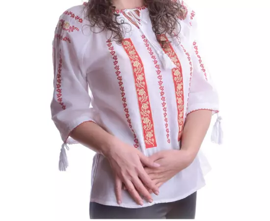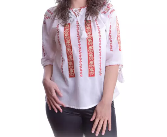 Bluza Tip Ie Traditionala Alba cu Motiv Geometric Rosu de Dama - IMS71