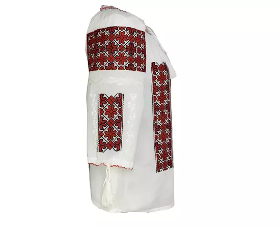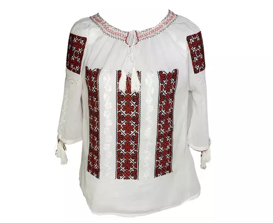 Bluza Tip Ie Traditionala Alba cu Motiv Geometric Rosu de Dama - IMS75