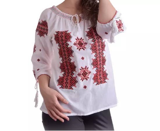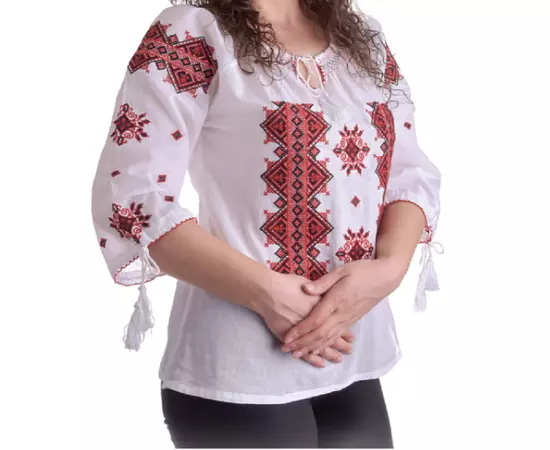 Bluza Tip Ie Traditionala Alba cu Motiv Geometric Rosu de Dama - IMS78