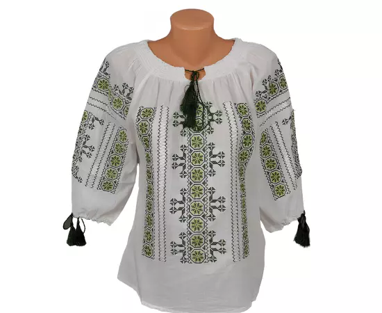 Bluza Tip Ie Traditionala Alba cu Motiv Geometric Verde de Dama - IMS66