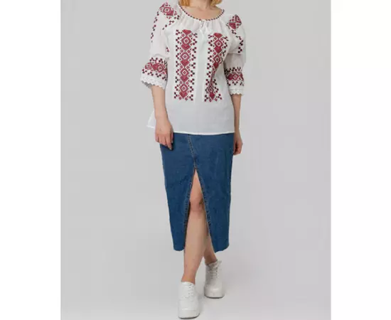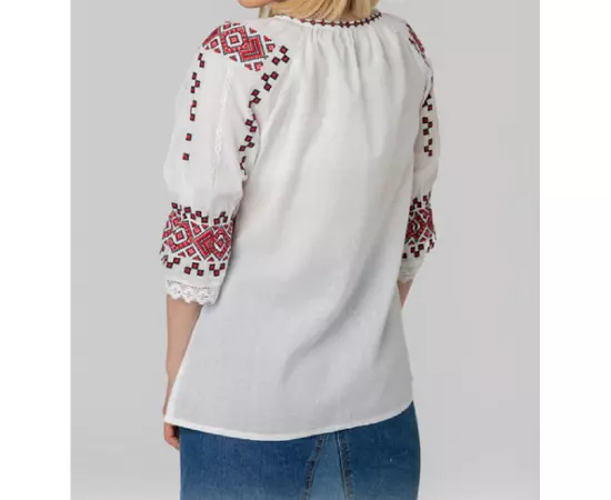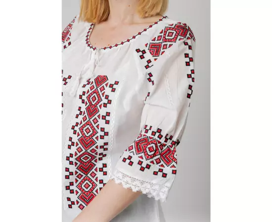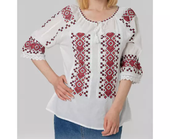 Bluza Tip Ie Traditionala Alba cu Motiv Geomtric Rosu de Dama - IMS127