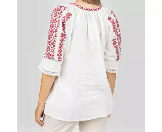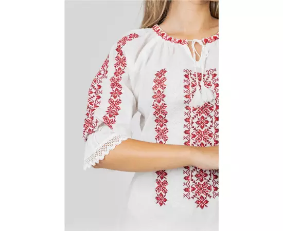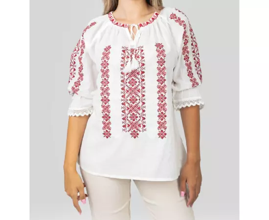 Bluza Tip Ie Traditionala Alba cu Motiv Floral Rosu de Dama- IMS32