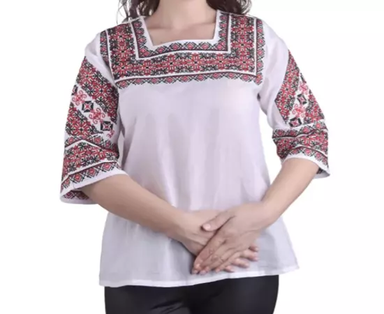 Bluza Traditionala Alba cu Motiv Geometric Rosu - BMG165