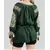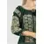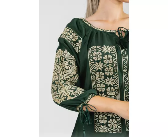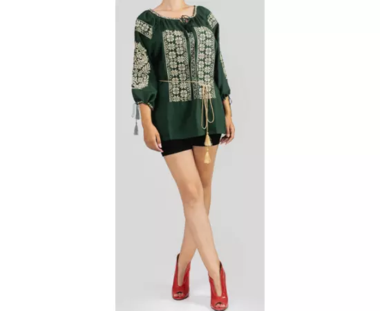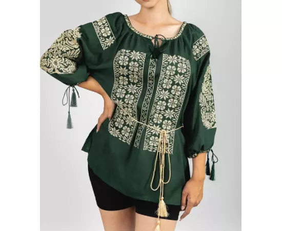 Bluza tip ie verde din viscoza cu maneca 3/4 si motiv floral auriu. Modelul are inaltimea de 162 cm si poarta marimea S.