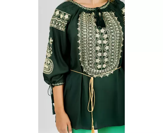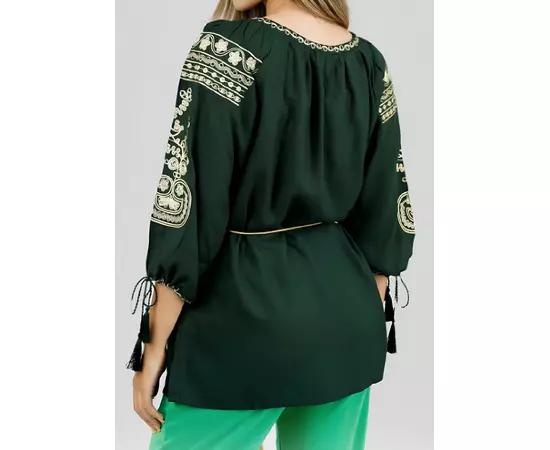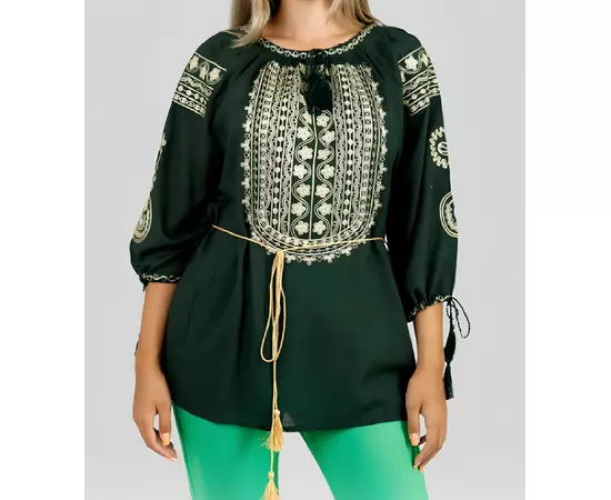Bluza tip ie verde din viscoza cu maneca 3/4 si motiv floral auriu.