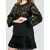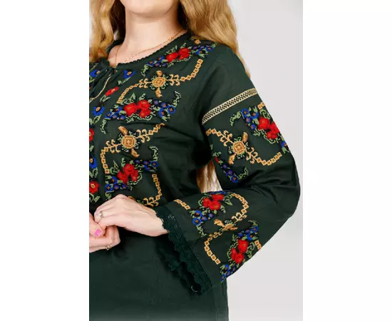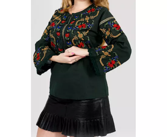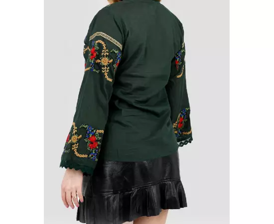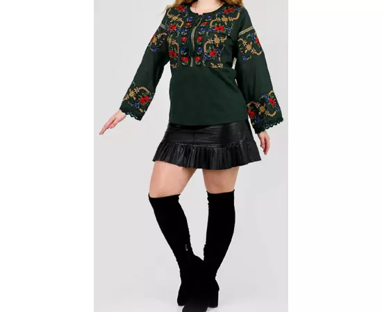 Bluza tip ie verde din bumbac cu maneca lunga si motiv floral multicolor. Modelul are 160 cm inaltime si poarta marimea S.