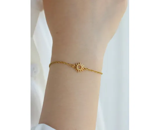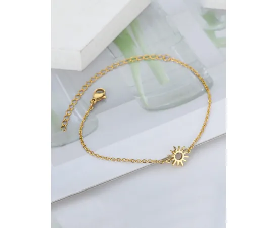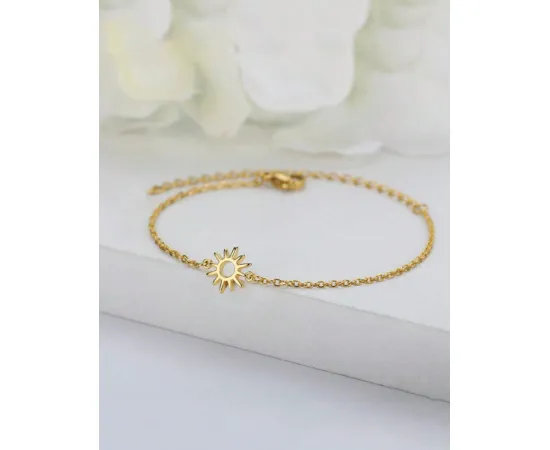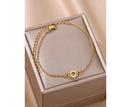 Strălucirea soarelui, la încheietura ta. Solis este o brățară aurie delicată, cu un soare stilizat plasat fix în mijloc și un lănțișor reglabil care o face ușor de purtat pentru orice încheietură. Designul minimalist o transformă într-o piesă versatilă – perfectă pentru purtare zilnică sau ca accent într-o ținută mai specială.