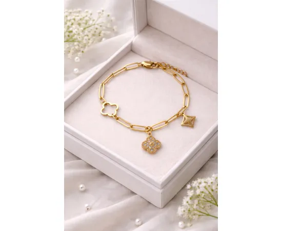 Realizată din cupru de înaltă calitate și finisată cu un strat delicat de aur, această brățară îmbină durabilitatea cu strălucirea luxoasă. Designul său versatil o face potrivită atât pentru ținute de zi, cât și pentru ocazii speciale, oferind o notă subtilă de eleganță fiecărui outfit.