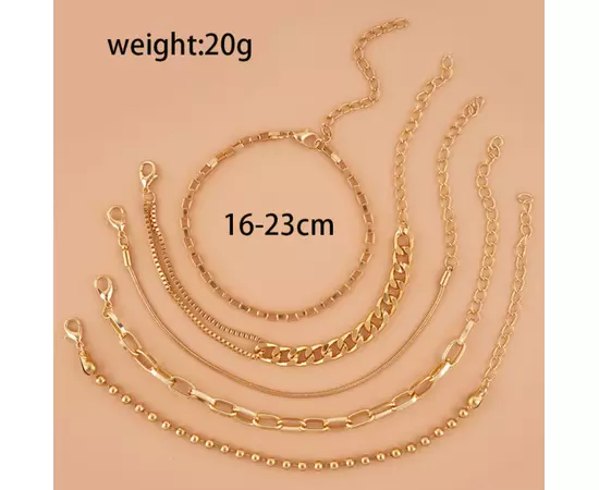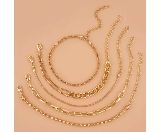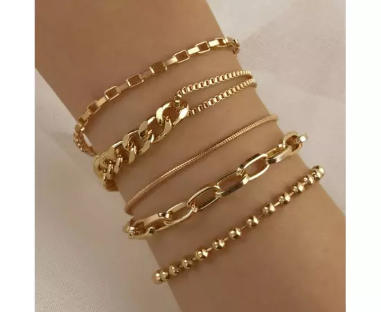 Brățările elegante aurii în set de 5 piese sunt accesorii de bijuterie ce emană rafinament și stil. Fiecare brățară este o piesă distinctivă, dar împreună formează o combinație armonioasă și sofisticată.