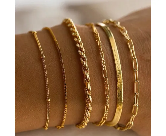 Brățările elegante aurii în set de 5 piese sunt accesorii de bijuterie ce emană rafinament și stil. Fiecare brățară este o piesă distinctivă, dar împreună formează o combinație armonioasă și sofisticată.