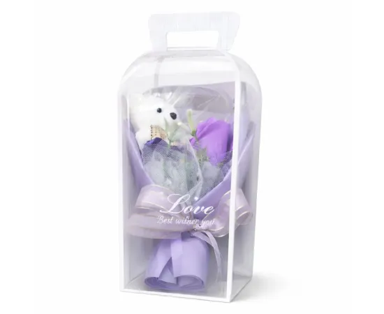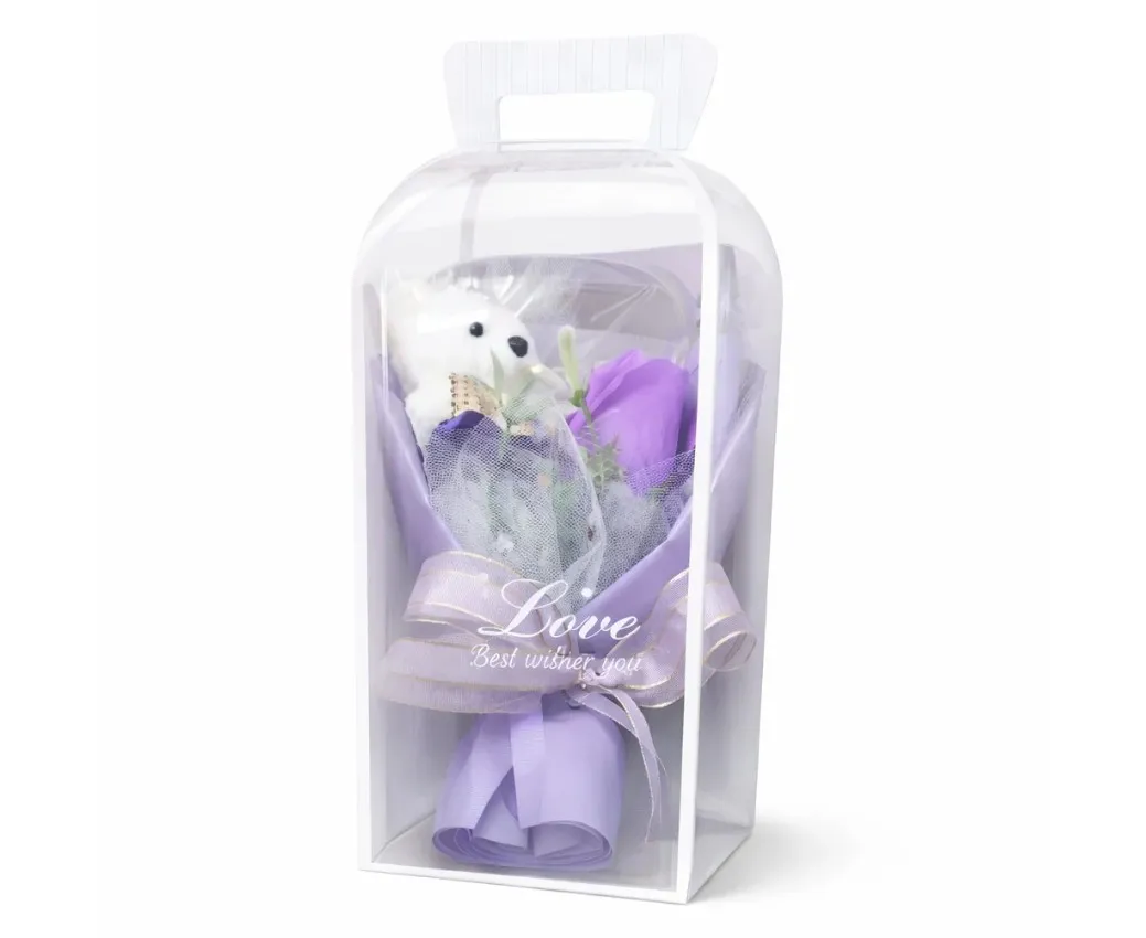 Un cadou plin de tandrețe, creat pentru a aduce zâmbete și emoție sinceră. Aranjamentul floral elegant, în nuanțe romantice de roșu, este completat de un ursuleț adorabil, simbol al afecțiunii și grijii. Totul este prezentat într-o cutie transparentă premium, decorată cu fundiță fină și mesajul „Love – Best wishes for you”, gata de oferit unei persoane dragi.