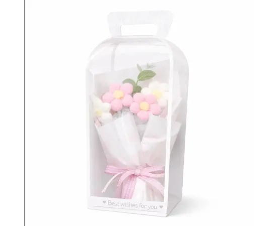 Un cadou special, creat pentru a transmite căldură și afecțiune într-un mod unic. Florile tricotate, realizate cu atenție la detalii, oferă un farmec aparte și o notă de originalitate, fiind o alternativă deosebită la florile clasice. Aranjamentul este prezentat într-o cutie elegantă, transparentă, decorată cu fundiță delicată și mesajul „Best wishes for you”, gata de oferit unei persoane dragi.