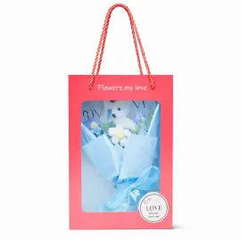 Un cadou delicat, creat pentru a transmite emoție și tandrețe din prima clipă. Aranjamentul floral, completat de un ursuleț adorabil, este prezentat într-o cutie elegantă cu fereastră, care lasă să se vadă frumusețea detaliilor din interior. Fundița fină și mesajele romantice transformă acest produs într-o surpriză perfectă pentru o persoană dragă.