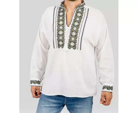 Camasa barbateasca traditionala alba din bumbac cu maneca lunga si motiv traditional verde.