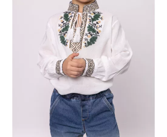 Camasa traditionala de baieti alba cu motiv floral verde
