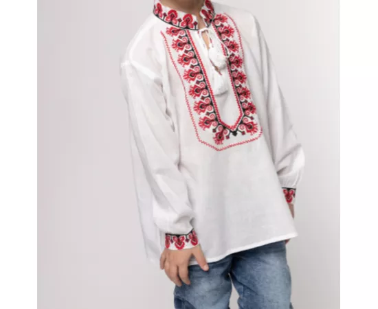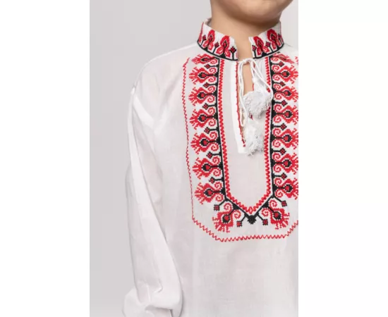 Camasa traditionala de baieti alba din bumbac cu maneca lunga si motiv traditional rosu