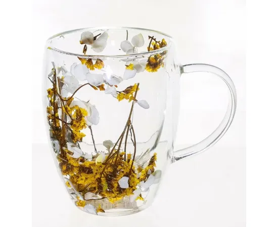 Cana din sticla borosilicata pereti dubli 350ml flori uscate galbene- INV03