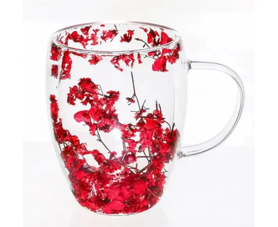 Cana din sticla borosilicata pereti dubli 350ml flori uscate rosii - INV01