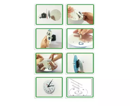 Toate accesoriile necesare montajului sunt incluse in pachet. Ceasul decorativ este usor de asamblat cu ajutorul benzilor dublu-adezive. Cifrele sunt din spuma peste care se aplica acril colorat, lucios.