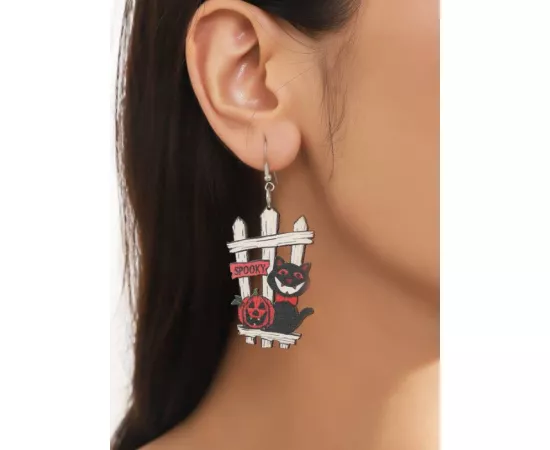 Unul dintre cercei reprezintă un mic dovleac portocaliu, cu detalii ale feței desenate cu atenție, inclusiv ochi mari și un zâmbet jucăuș. Celălalt cercel prezintă o pisică neagră cu ochi mari și misterioși, care pare să se pregătească pentru o aventură de Halloween. Acești doi prieteni se completează perfect și aduc un zâmbet pe fața ta și pe fața celor din jur în această sărbătoare a distracției.