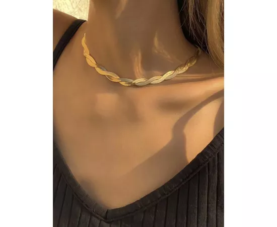 - Tip Dublu Choker: Colierul este compus din două benzi împletite care se așază una deasupra celeilalte, creând un efect stratificat și complex. Designul împletit adaugă textură și profunzime vizuală, oferind un look unic și elegant.