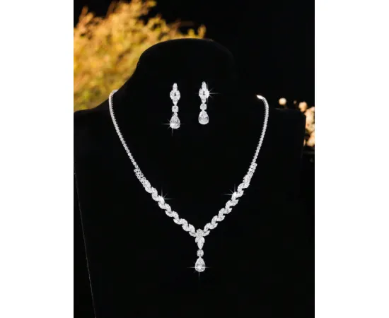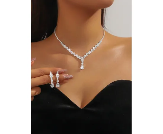 Adaugă un strop de eleganță fiecărei zile cu acest set de bijuterii format din colier și cercei, decorat cu zirconiu cubic strălucitor. Designul modern, în formă de picătură de apă, se potrivește perfect atât ținutelor casual, cât și celor de ocazie – nuntă, petrecere, festival sau cadou de vacanță. Finisajul argintiu adaugă un plus de rafinament și ușurință în asortare.