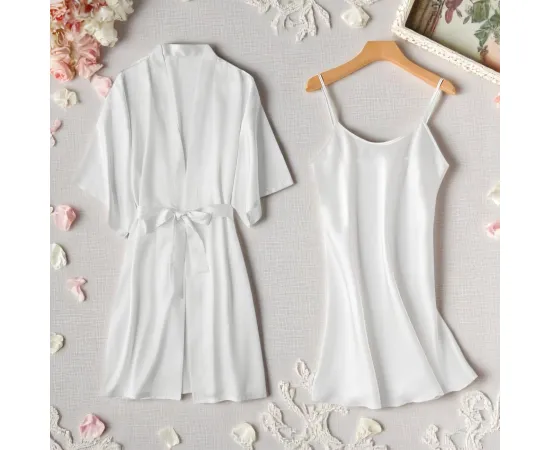 Compleu 2 Piese Dama, Halat si Cămașă de Noapte din Satin, Culoare Alb - MEI01