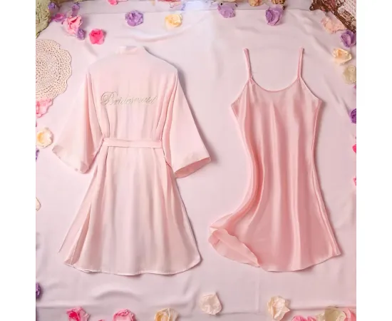 Compleu Bridesmaid 2 Piese Damă – Halat și Cămașă de Noapte din Satin, Culoare Roz – Eleganță și Delicatețe pentru Ziua Cea Mare