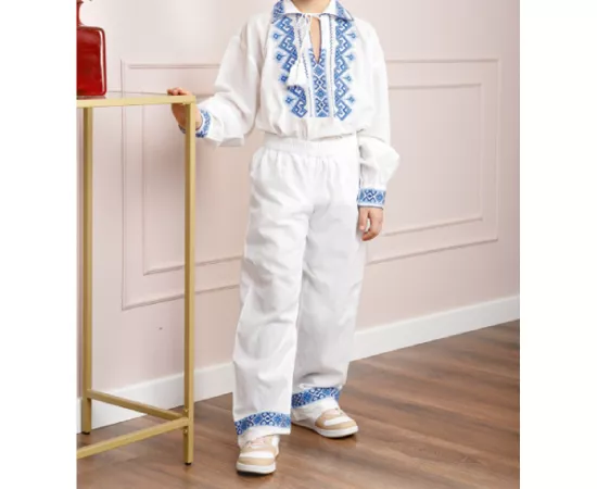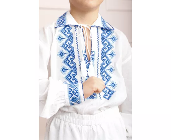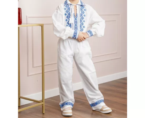 Compleu Traditional Alb pentru Baieti cu Motiv Geometric Albastru - IMS27