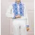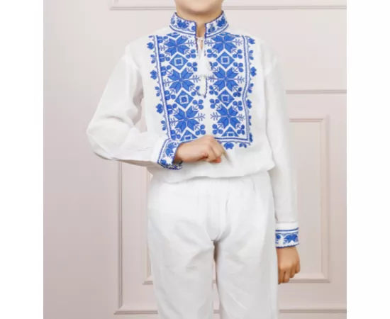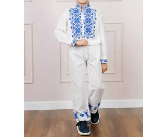 Compleu traditional alb cu motiv traditional albastru. Compleu compus din camasa si pantaloni. Camasa are maneci lungi si guler tunica, iar pantalonii au elastic in talie.