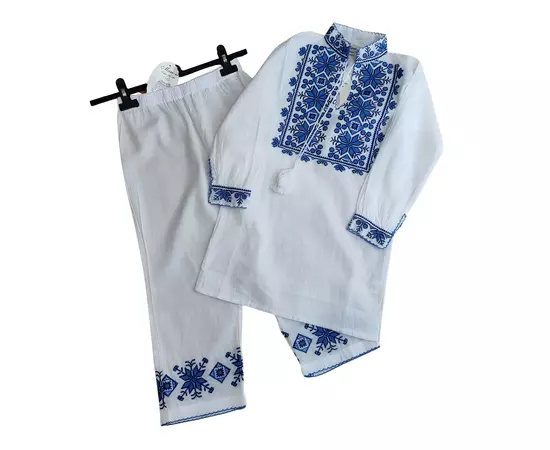 Compleu Traditional Alb pentru Baieti cu Motiv Geometric Albastru