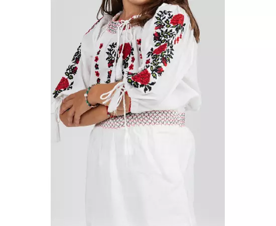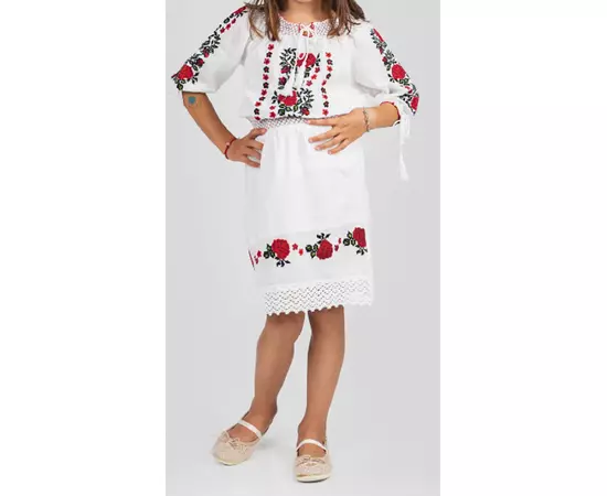 Compleu traditional alb pentru fetite cu motiv floral rosu - RTF17