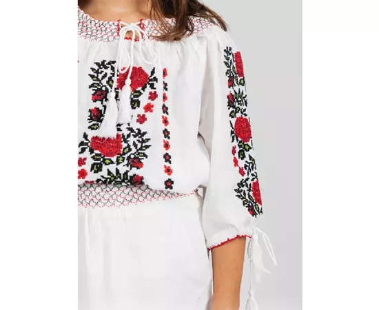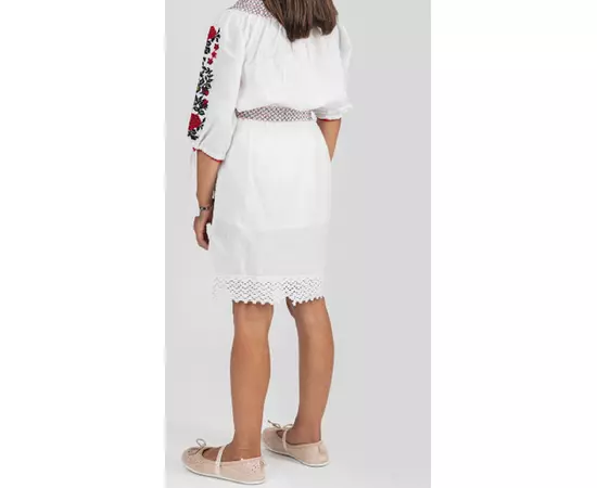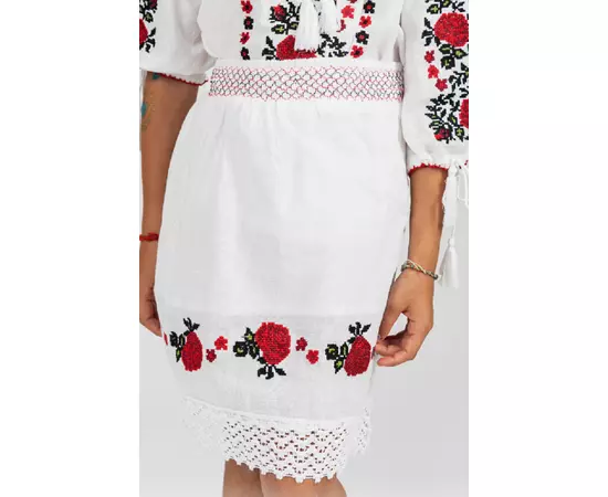 Compleu traditional alb cu motiv traditional rosu. Compleu compus din ie si fusta. Ia are maneca 3/4 cu snur, iar fusta are elastic in talie si dublura la interior.