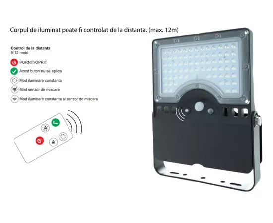 Lampa cu LED se instaleaza la o inaltime de 3-5 metri, are un unghi de detectie de 120 grade si o zona de detectie de maxim 8-12 metri. Unghiul de dispersie al luminii este de 140 de grade.
