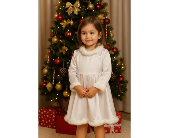 Transformă orice fetiță într-un adevărat Fulg de Nea cu acest costum delicat și elegant, perfect pentru serbările de iarnă, spectacole, colinde sau ședințe foto. Realizat din satin alb sidefat, costumul are accente din blăniță moale, care îi oferă un aspect magic, pur și rafinat. Materialul este plăcut la atingere, ușor și confortabil pentru momentele în care micuța dansează sau se joacă.