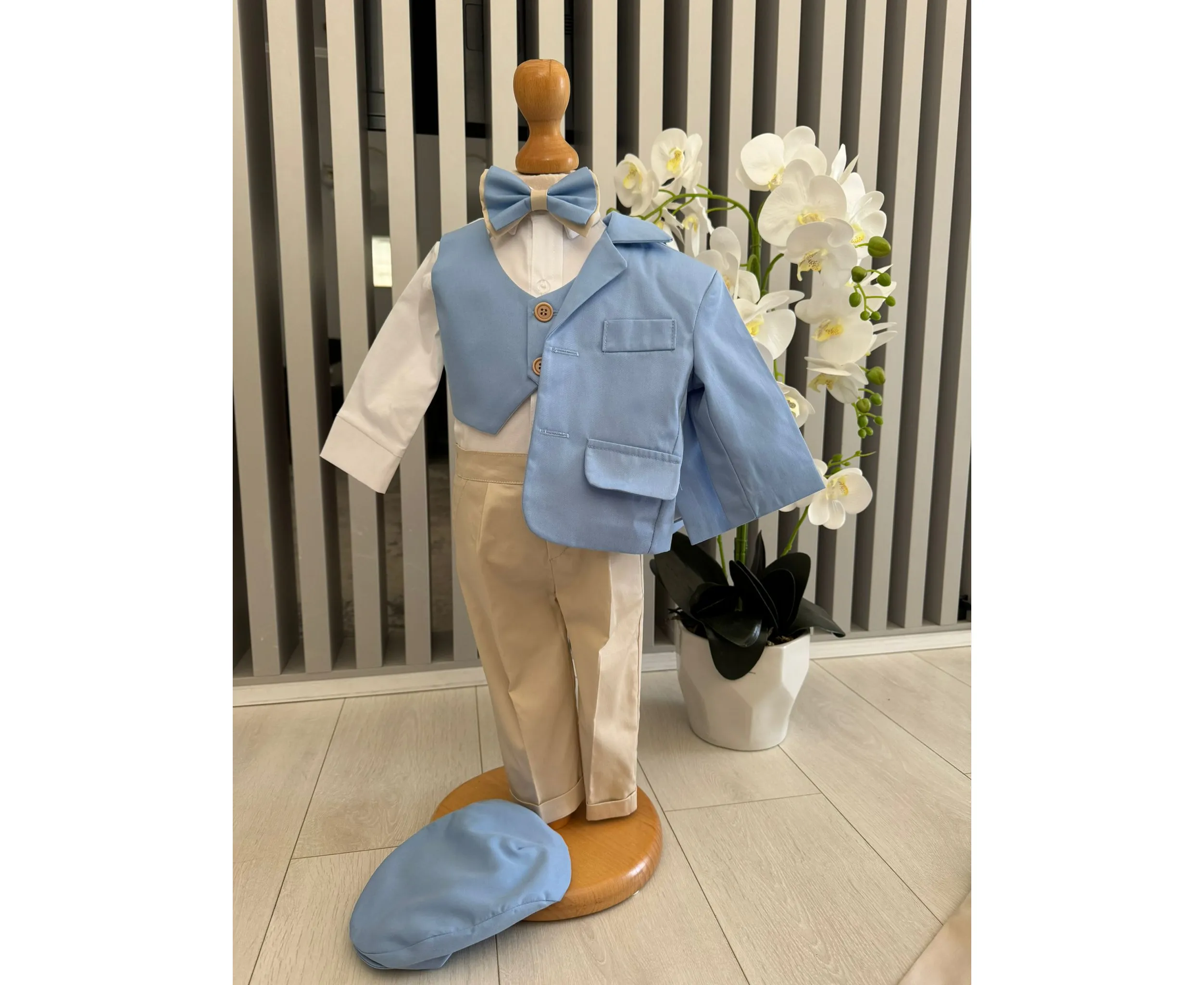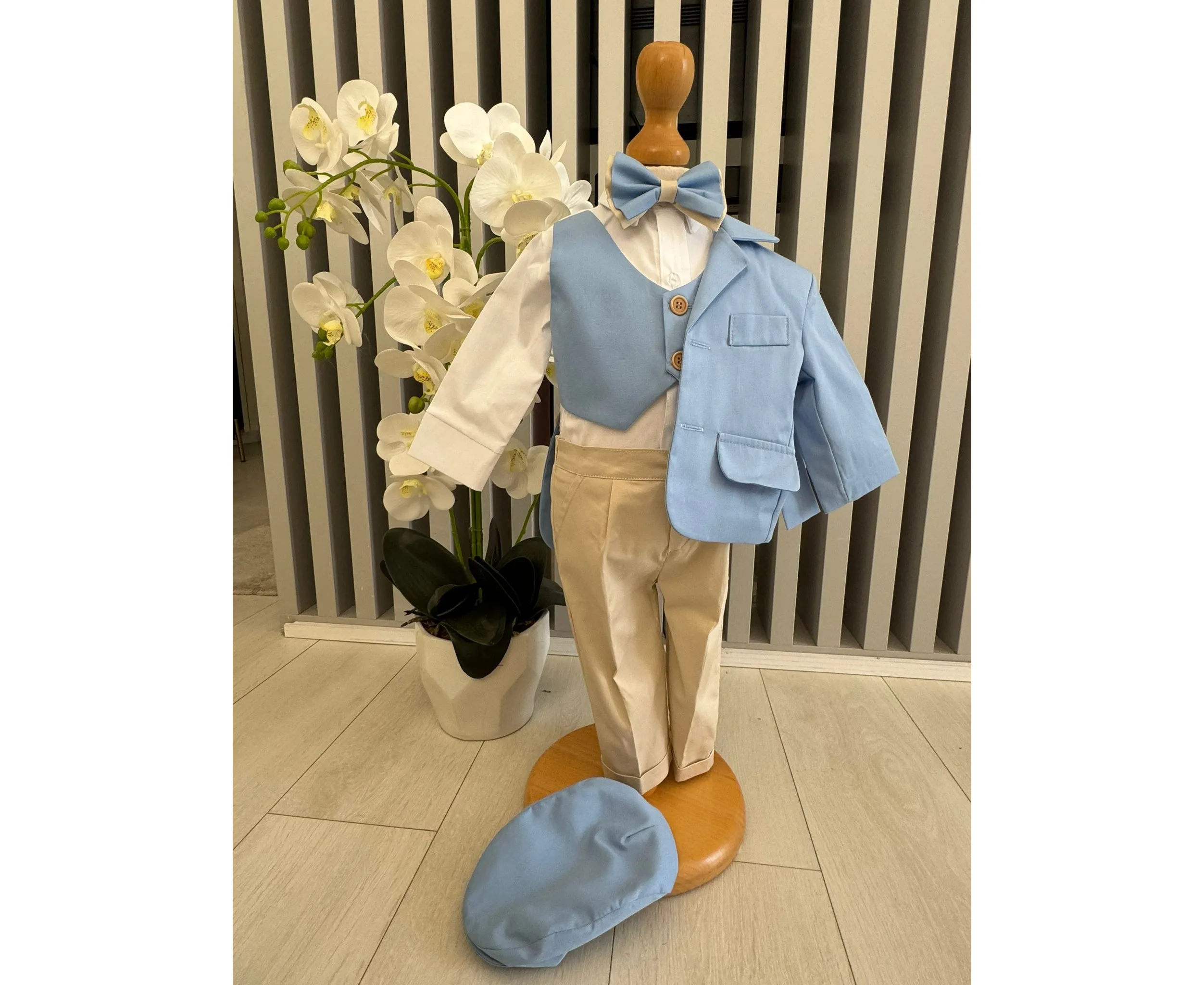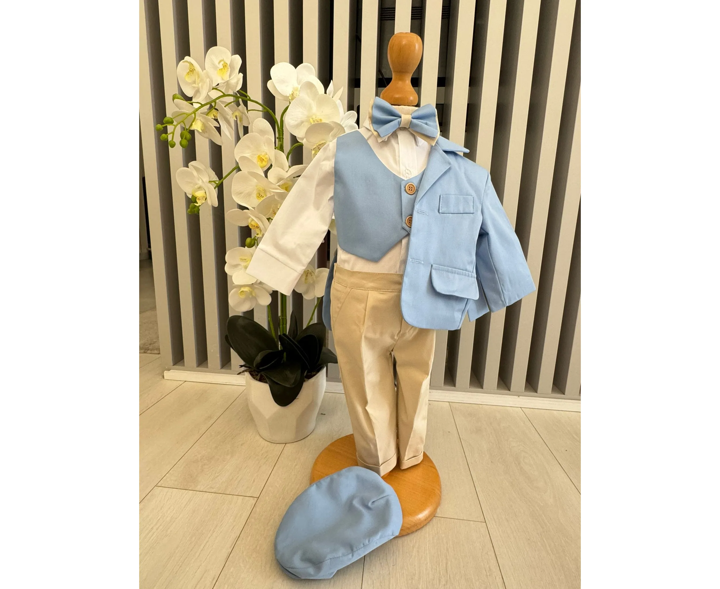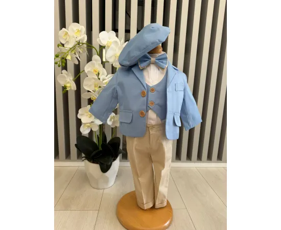 Costumul de botez pentru băieți este realizat cu grijă din materiale de calitate superioară, moi și delicate cu pielea sensibilă a bebelușului. Designul elegant îmbină rafinamentul clasic cu confortul absolut, fiind ideal pentru un eveniment special precum botezul