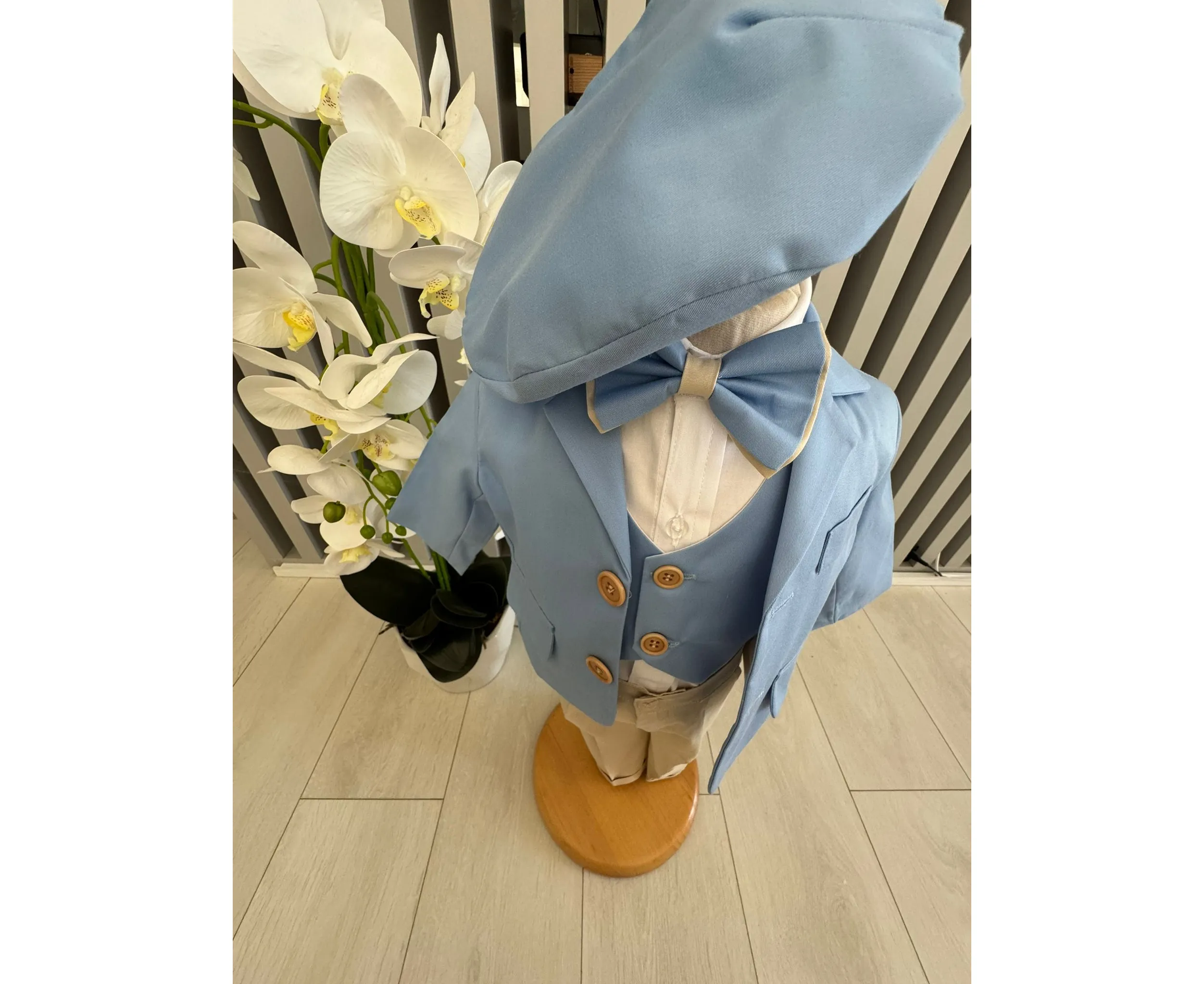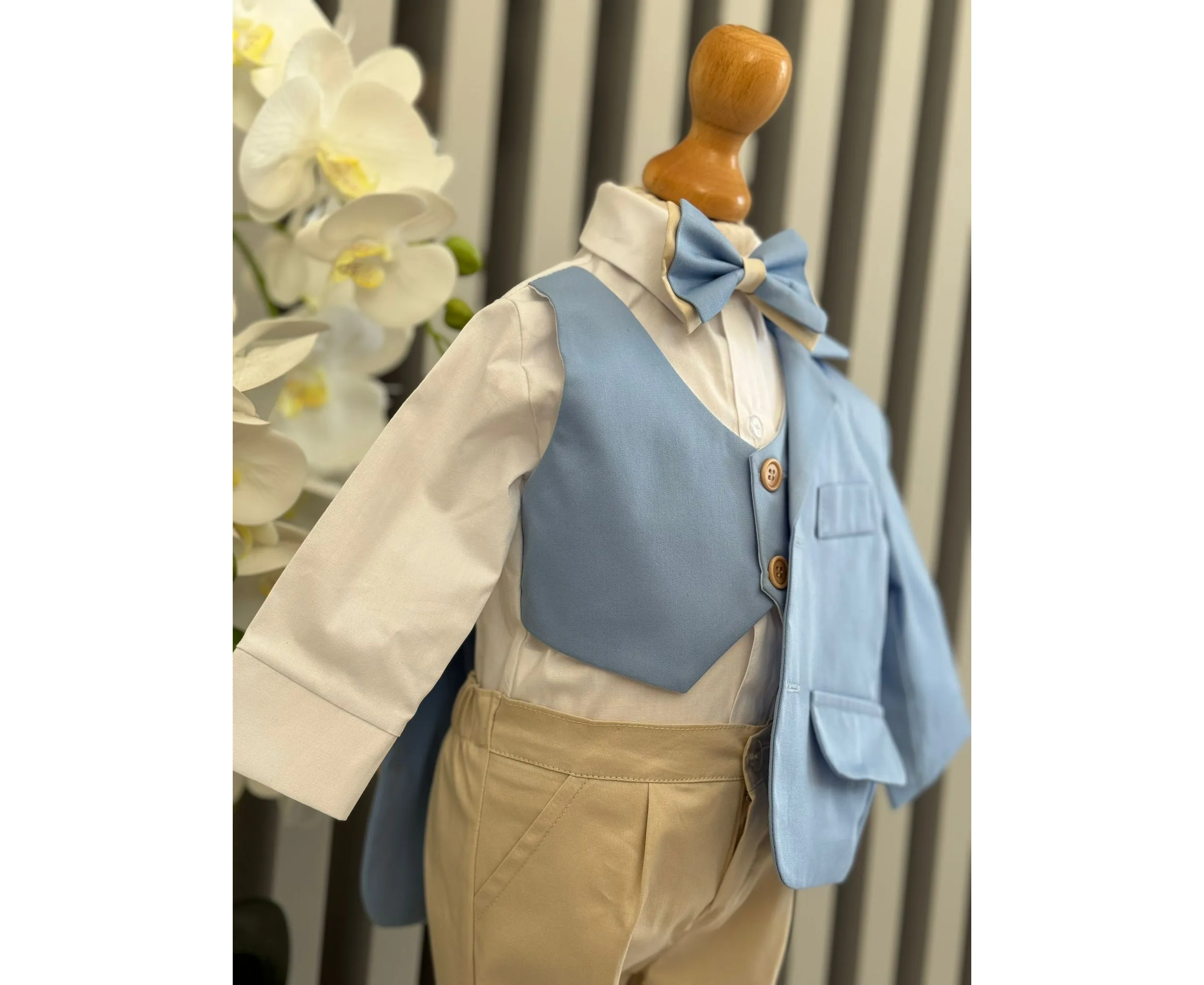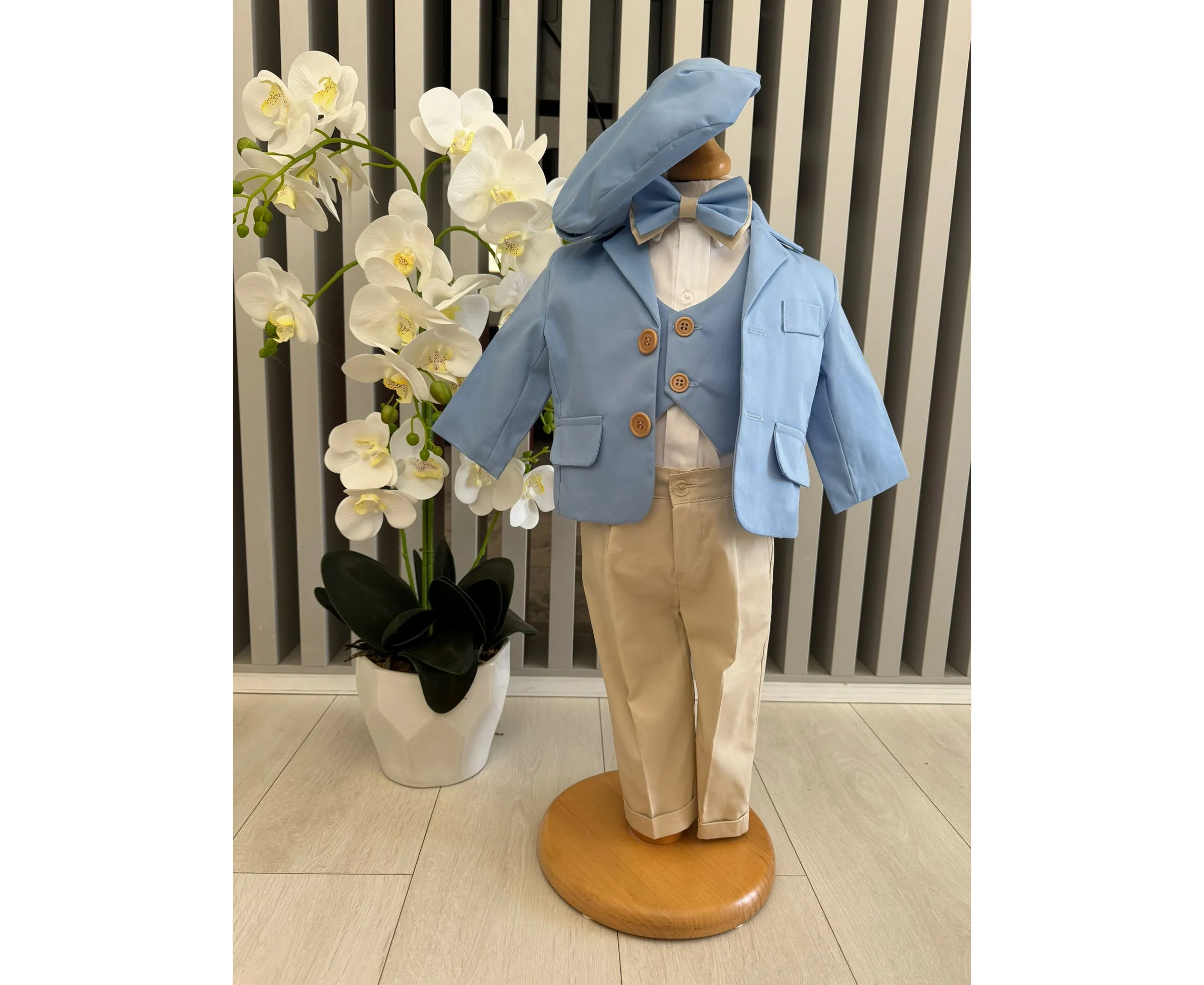 Costumul de botez pentru băieți este realizat cu grijă din materiale de calitate superioară, moi și delicate cu pielea sensibilă a bebelușului. Designul elegant îmbină rafinamentul clasic cu confortul absolut, fiind ideal pentru un eveniment special precum botezul