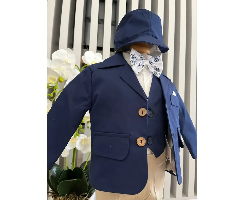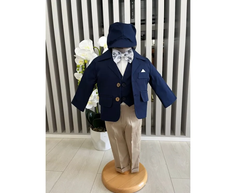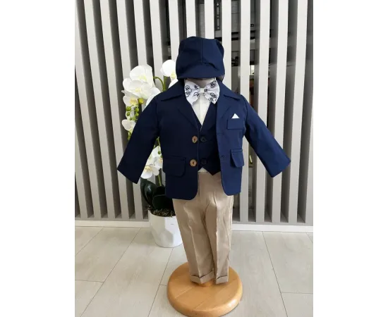 Costum botez 5 piese bumbac, albastru inchis - DPH371