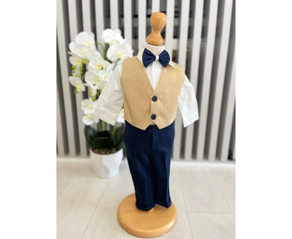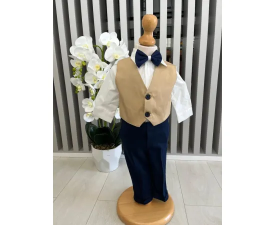 Costumul de botez pentru băieți este realizat cu grijă din materiale de calitate superioară, moi și delicate cu pielea sensibilă a bebelușului. Designul elegant îmbină rafinamentul clasic cu confortul absolut, fiind ideal pentru un eveniment special precum botezul