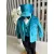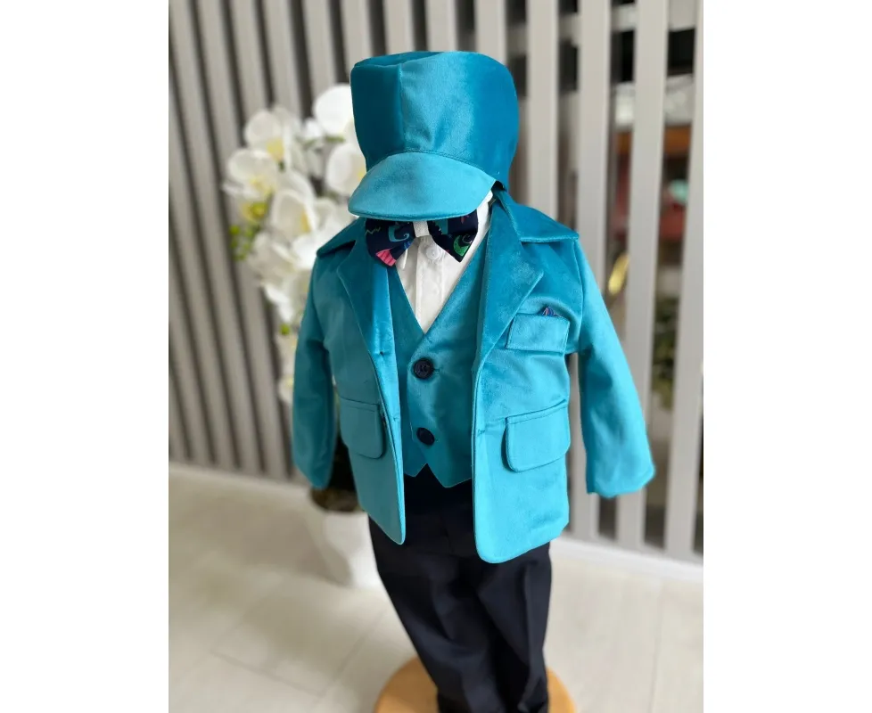 Costum botez 5 piese catifea, albastru deschis - DPH363