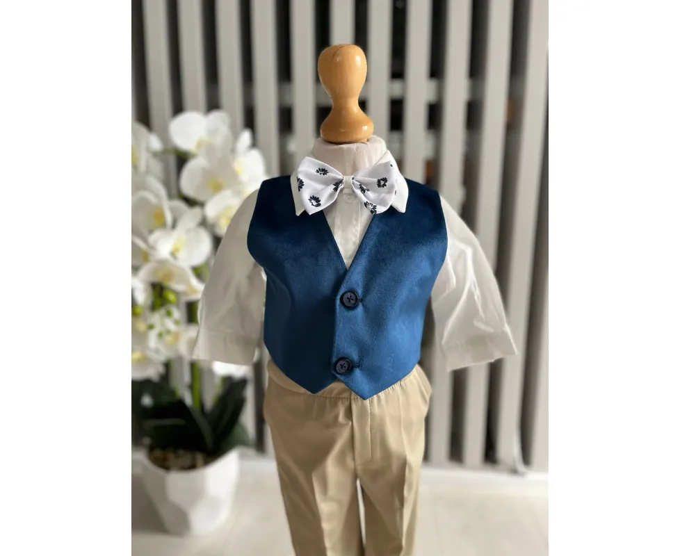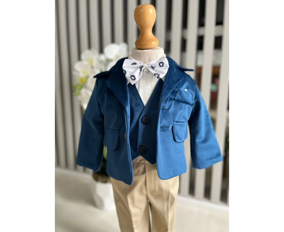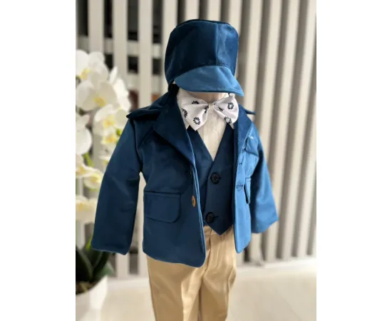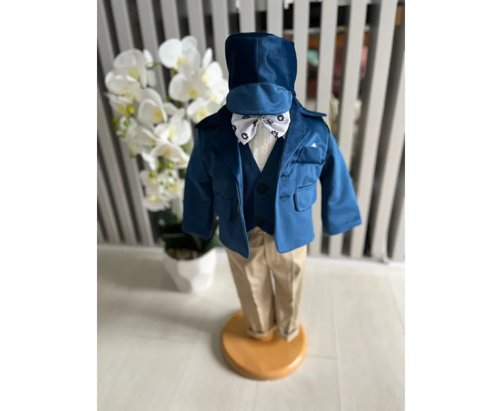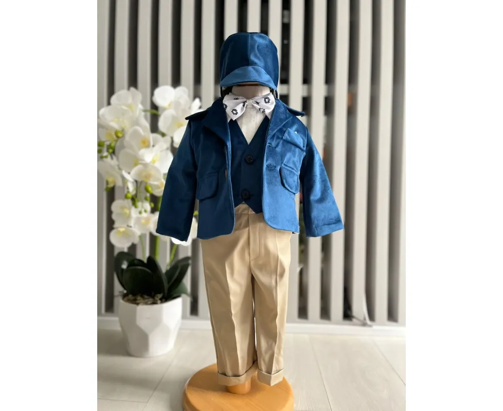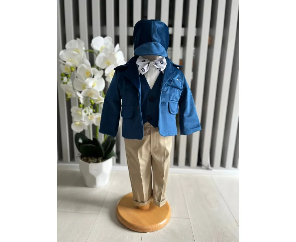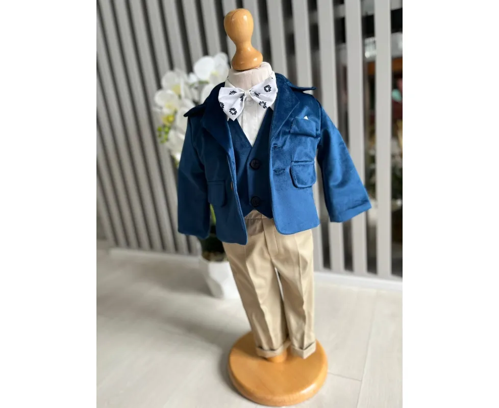 Costum botez 5 piese catifea, albastru - DPH366