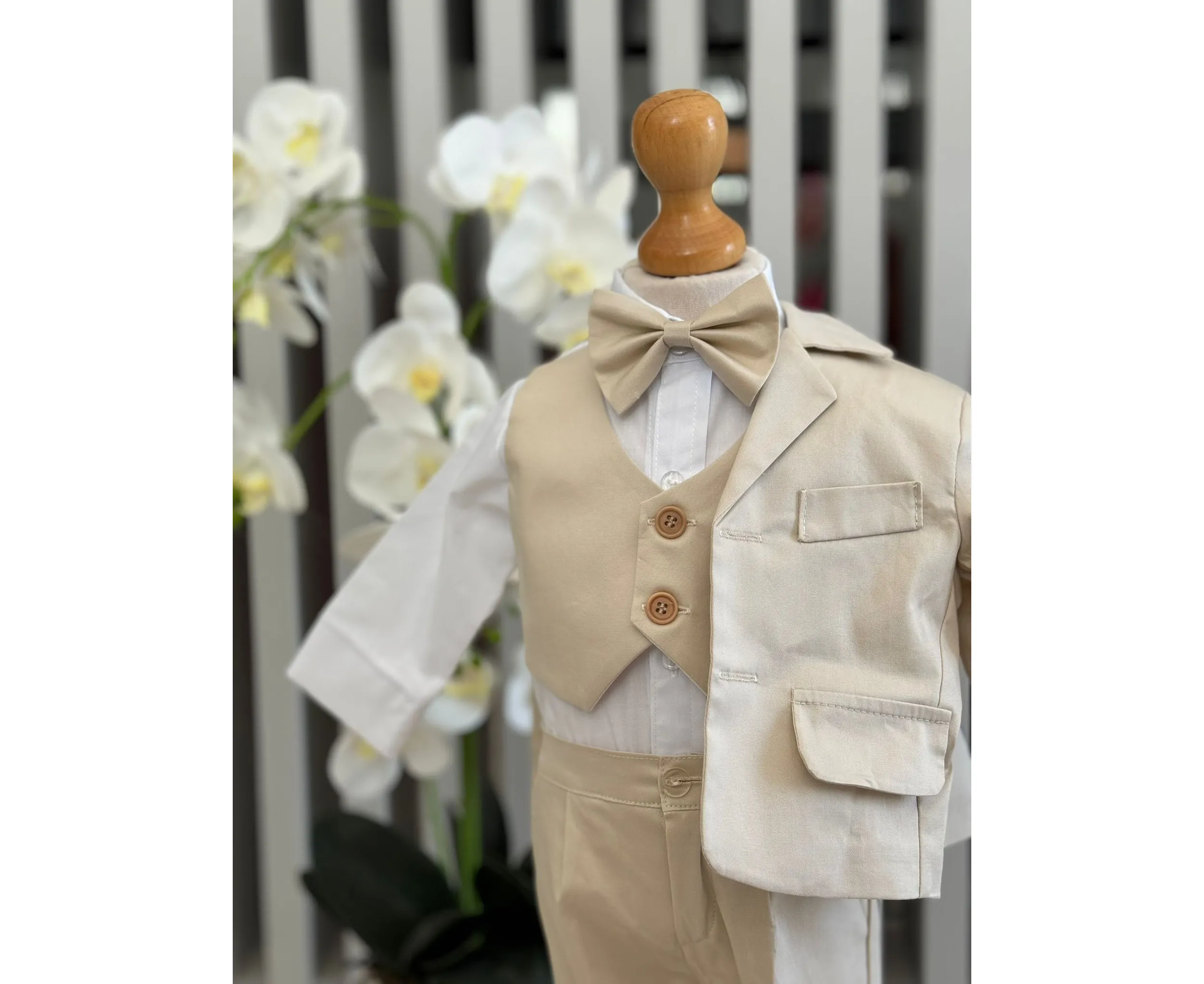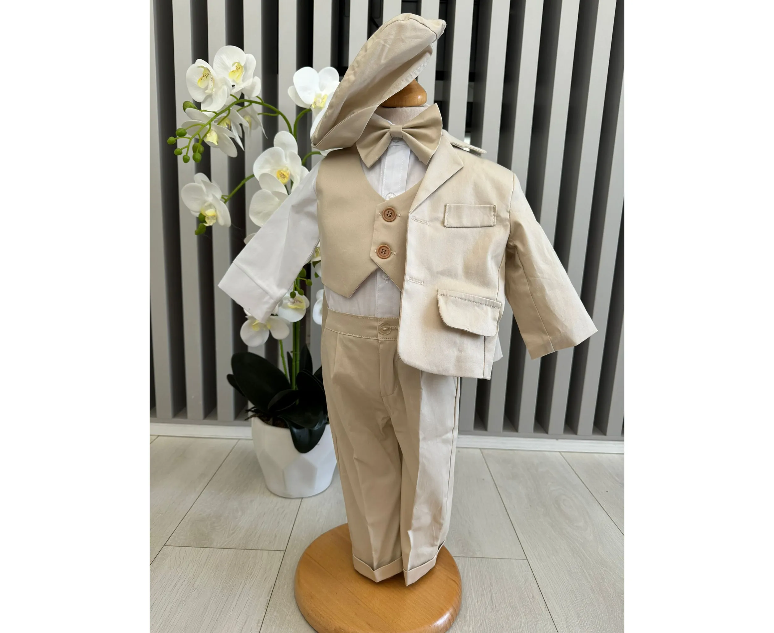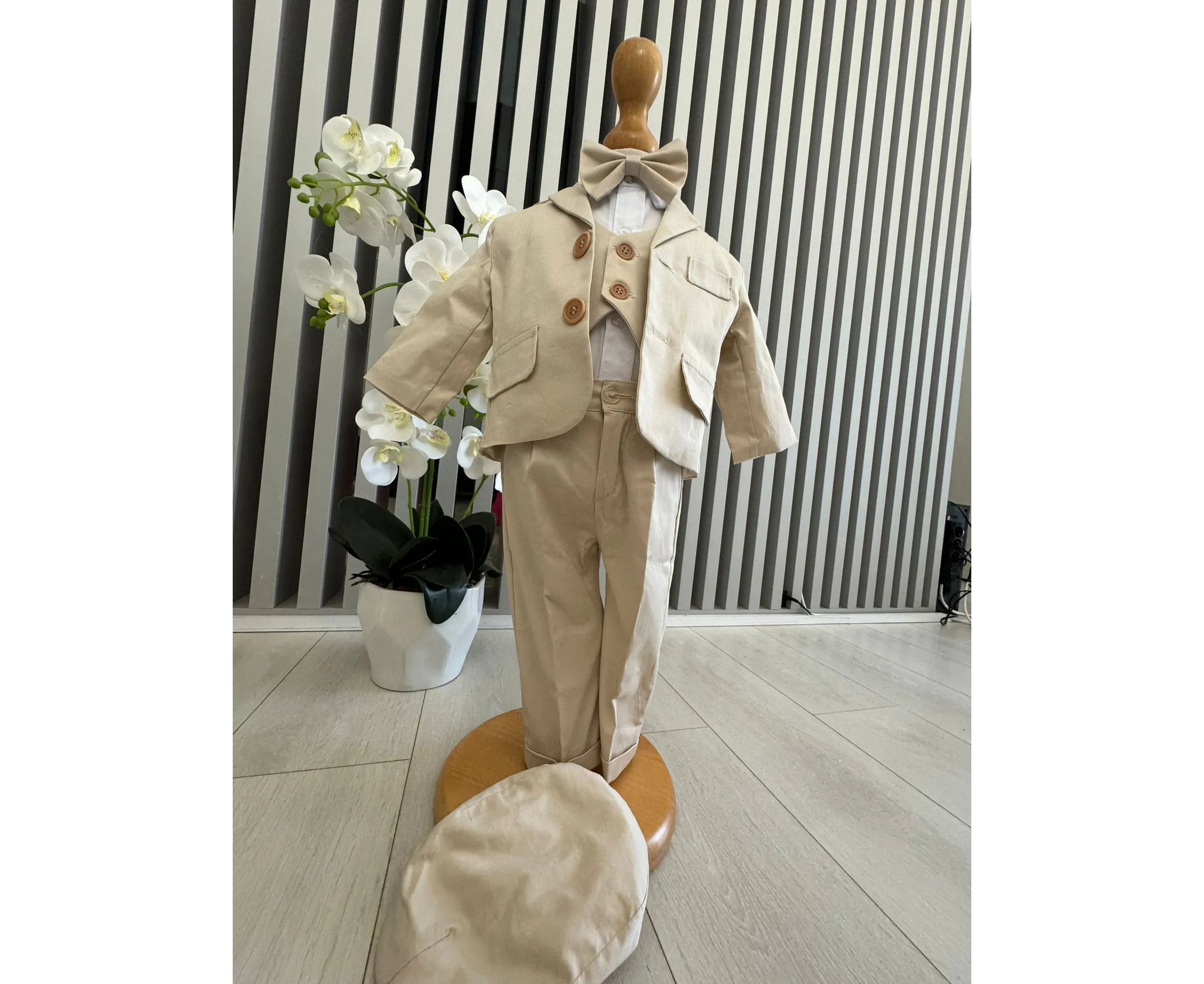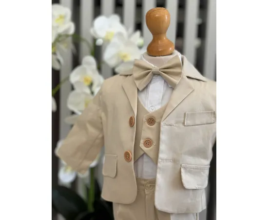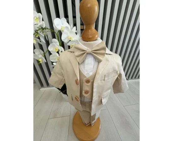 Costumul de botez pentru băieți este realizat cu grijă din materiale de calitate superioară, moi și delicate cu pielea sensibilă a bebelușului. Designul elegant îmbină rafinamentul clasic cu confortul absolut, fiind ideal pentru un eveniment special precum botezul