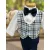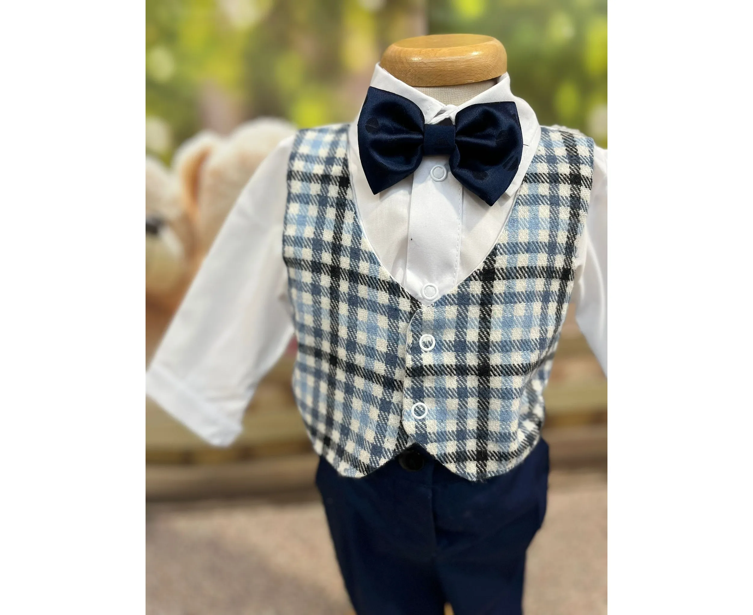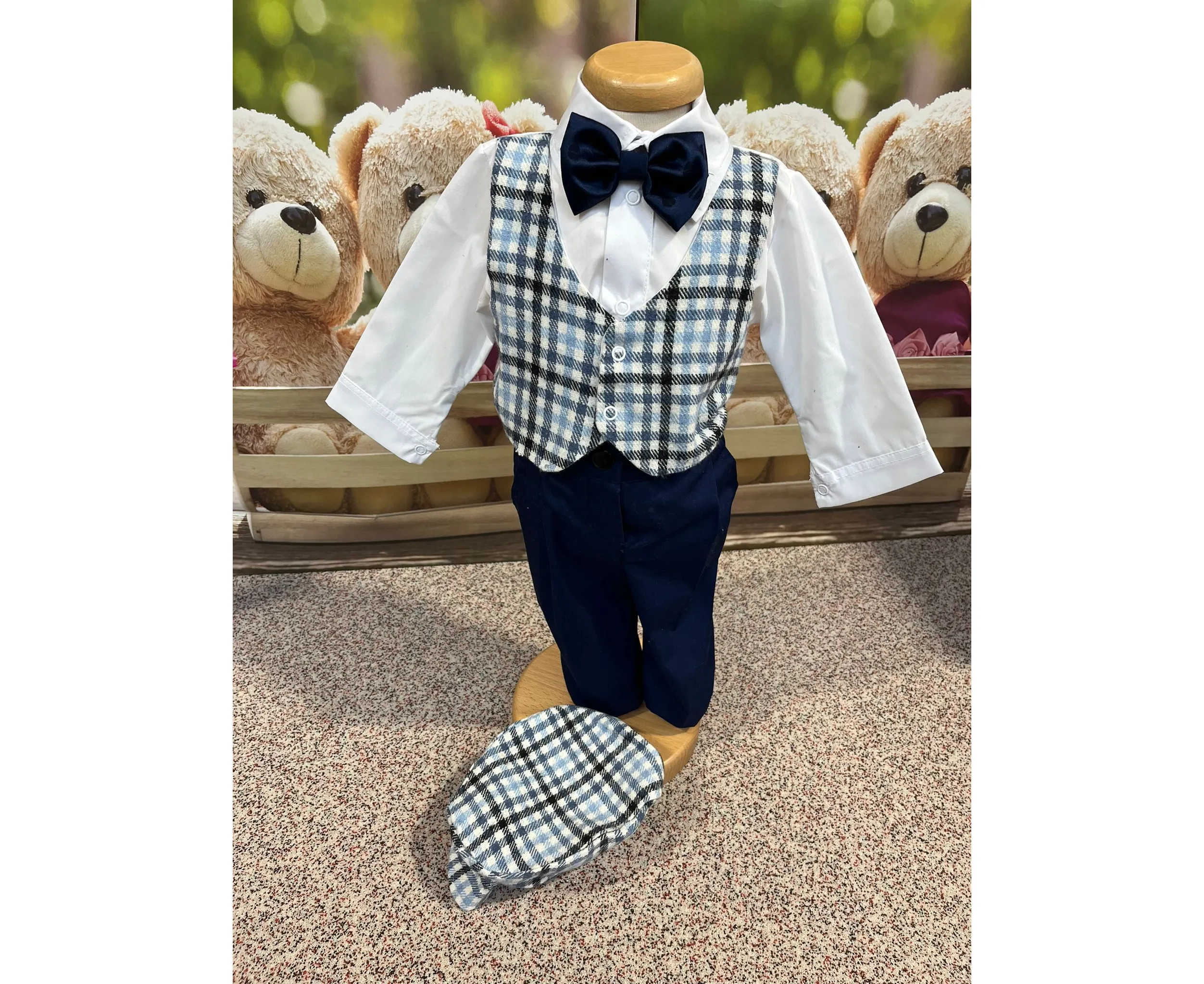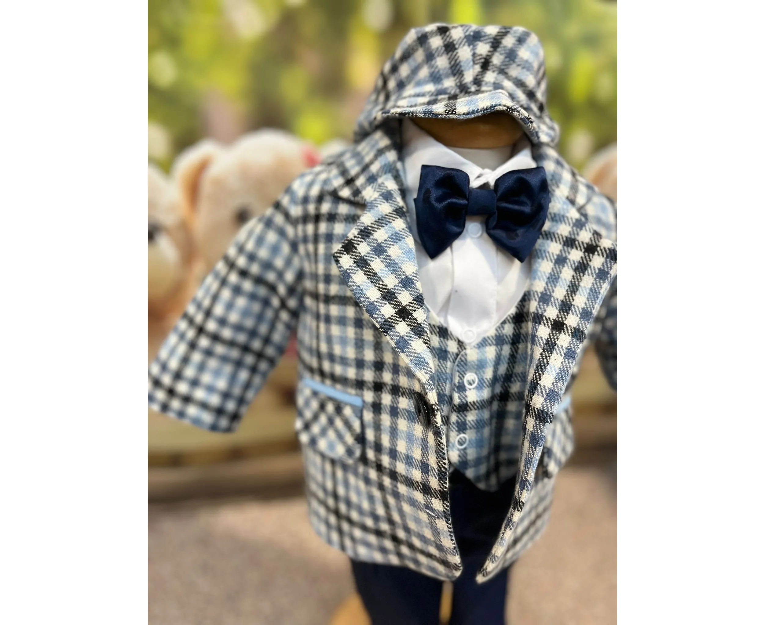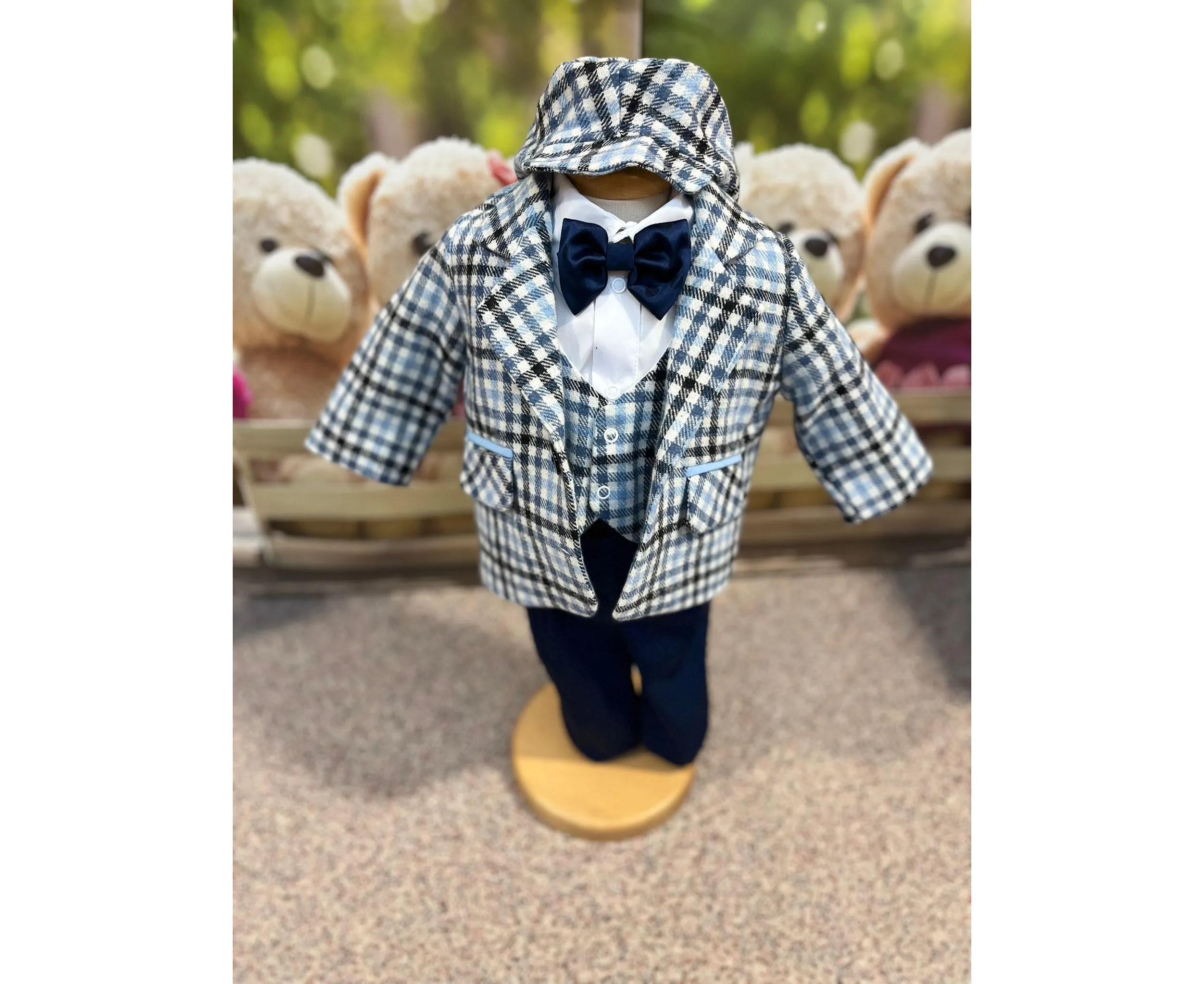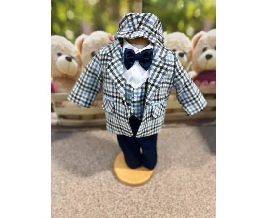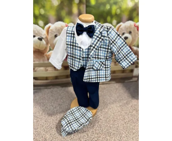 Costum botez 5 piese stofa, carouri albastru - DPH350