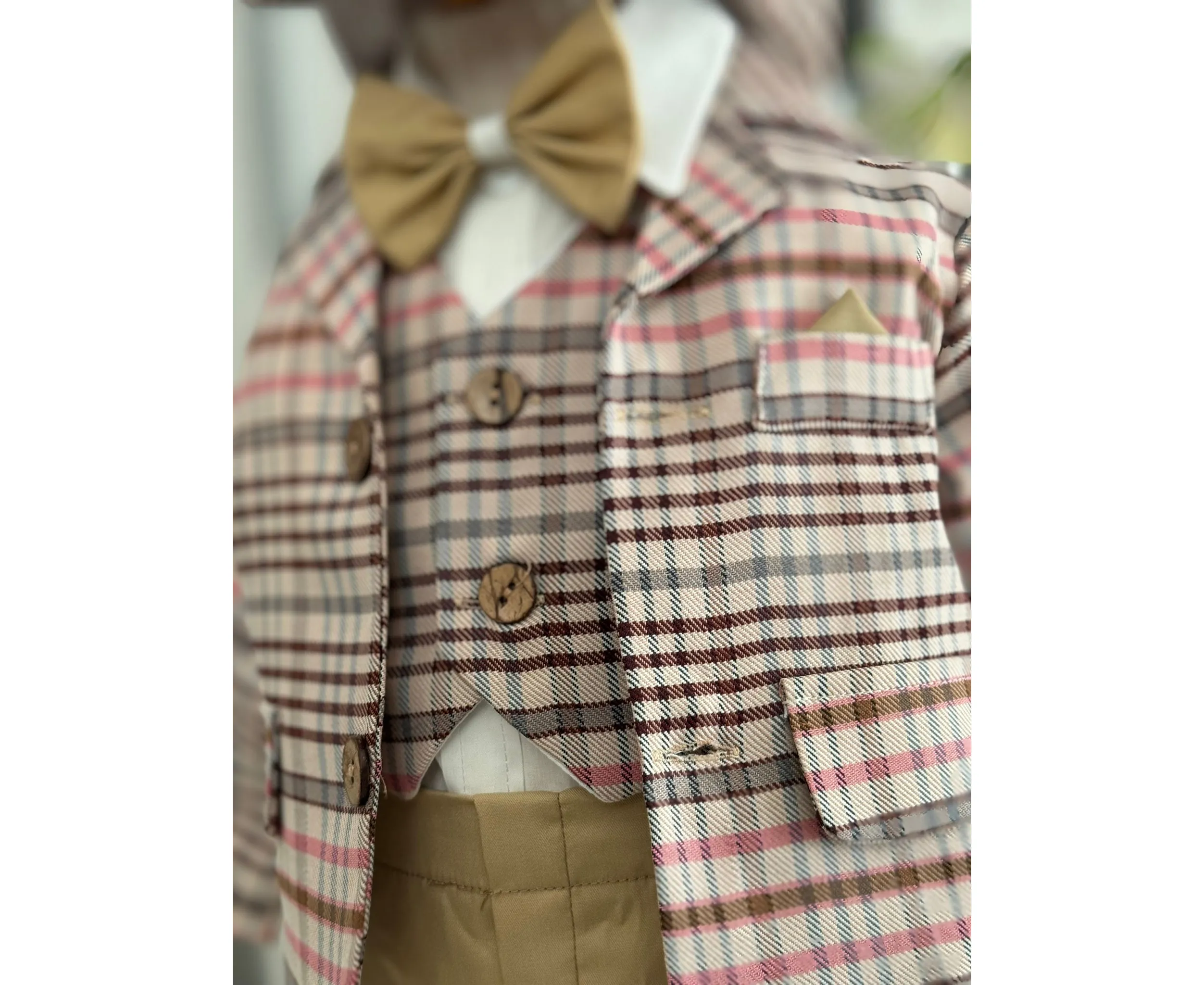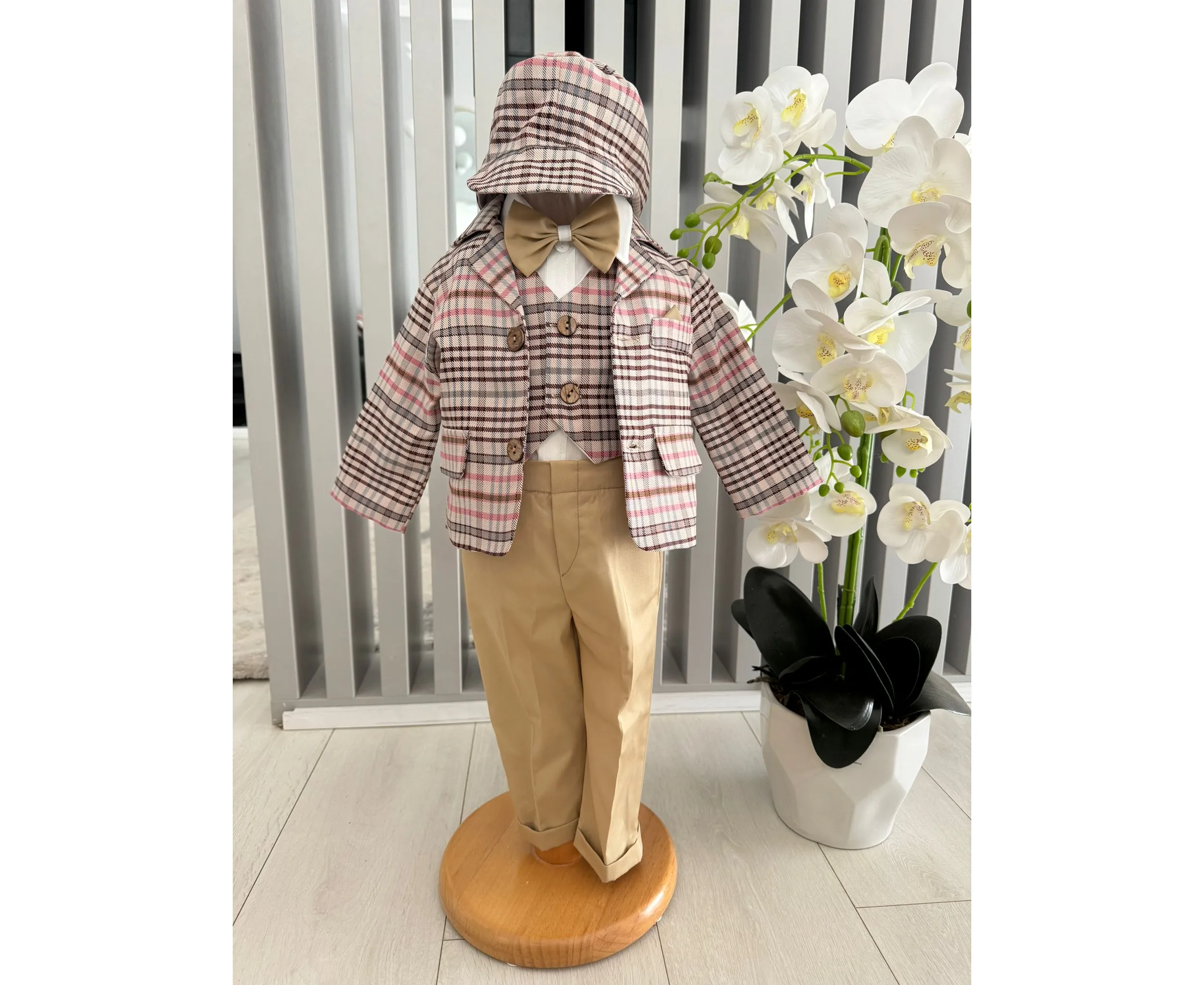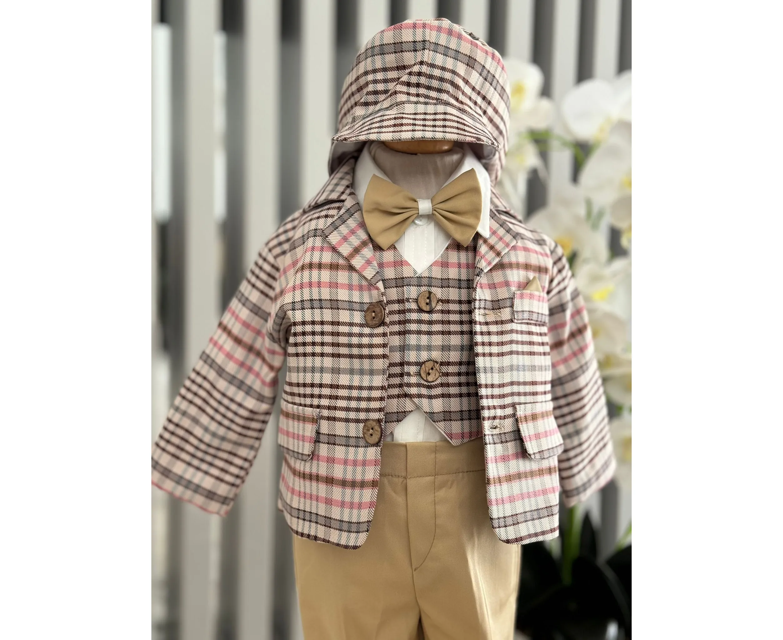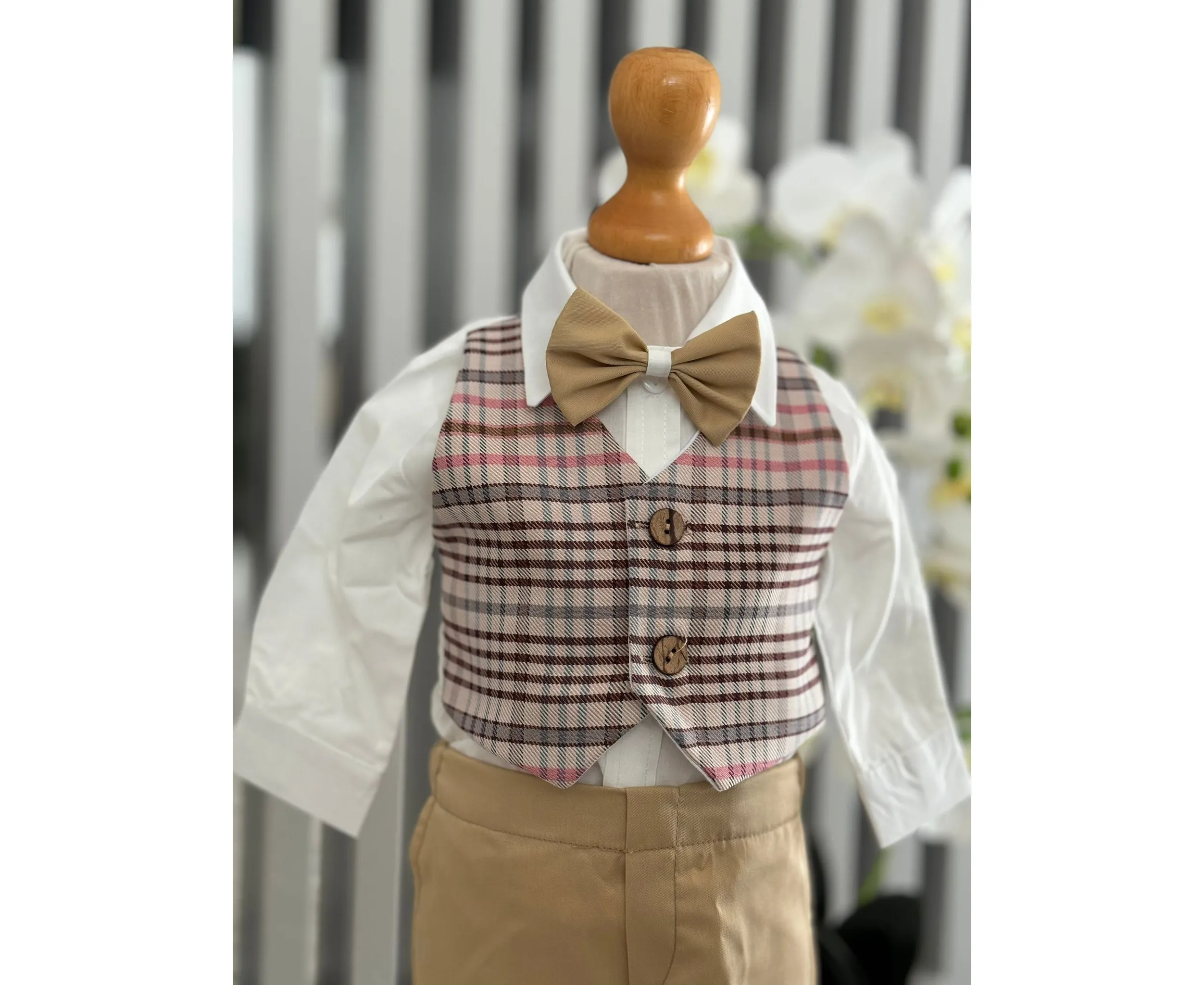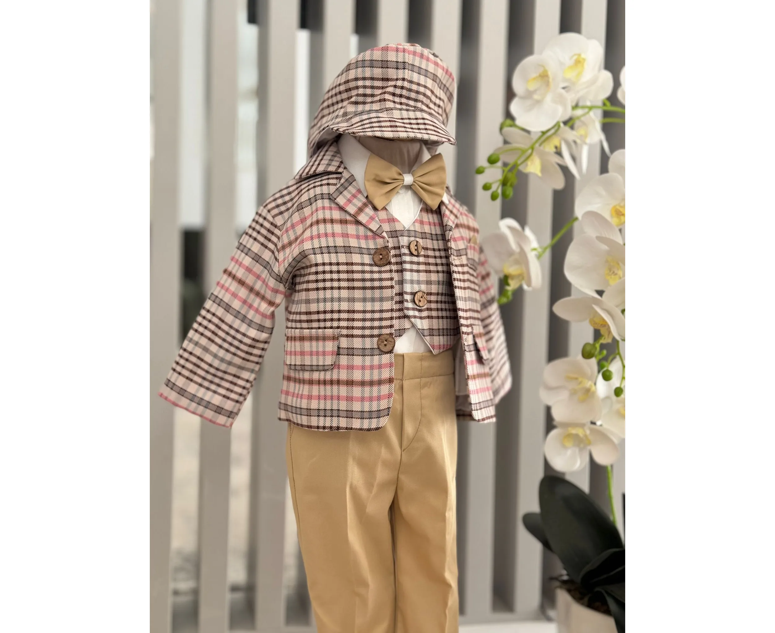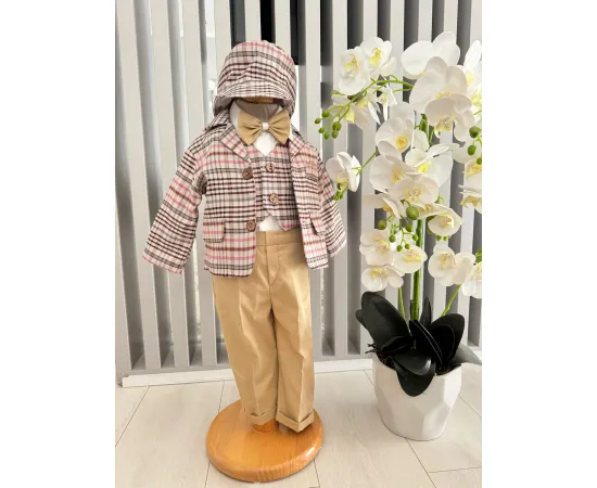 Costumul de botez pentru băieți este realizat cu grijă din materiale de calitate superioară, moi și delicate cu pielea sensibilă a bebelușului. Designul elegant îmbină rafinamentul clasic cu confortul absolut, fiind ideal pentru un eveniment special precum botezul