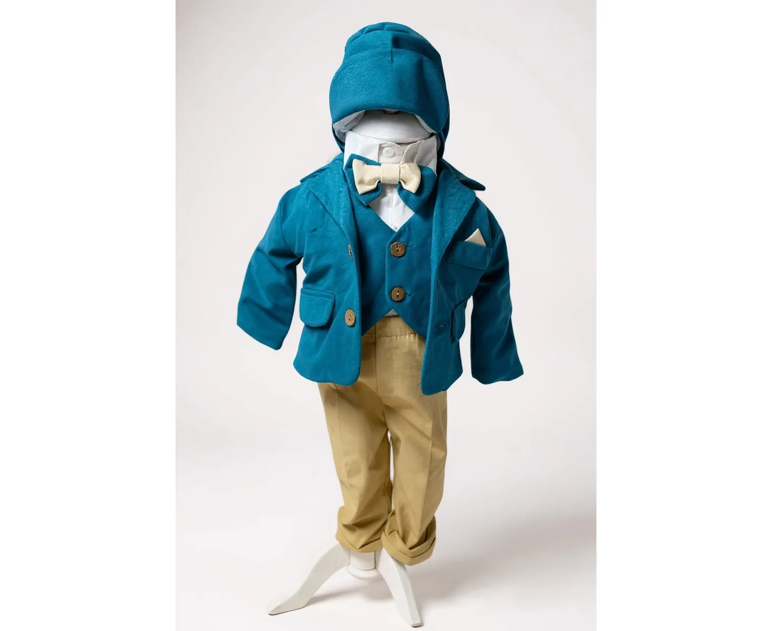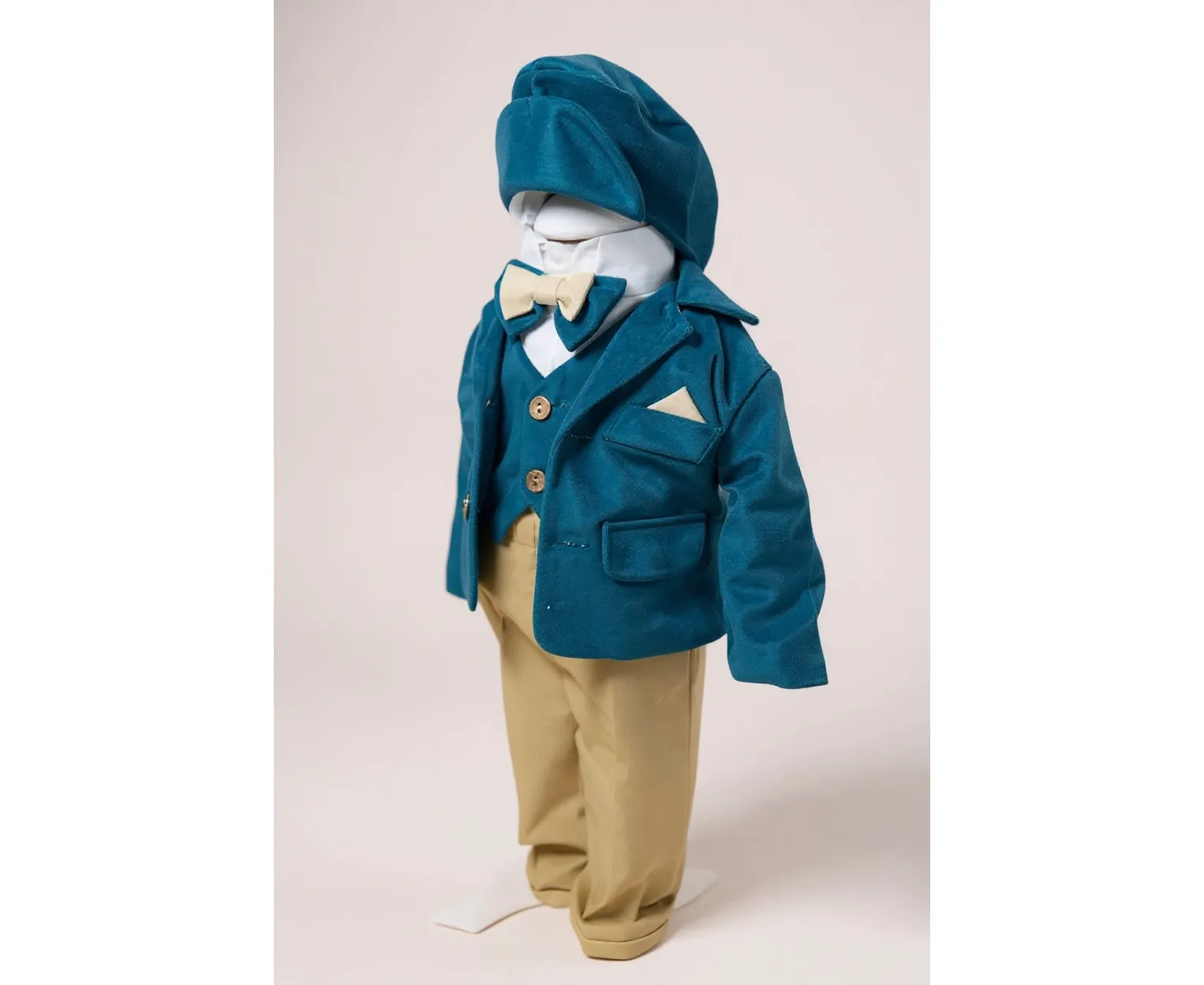 Costumul de botez pentru băieți este realizat cu grijă din materiale de calitate superioară, moi și delicate cu pielea sensibilă a bebelușului. Designul elegant îmbină rafinamentul clasic cu confortul absolut, fiind ideal pentru un eveniment special precum botezul