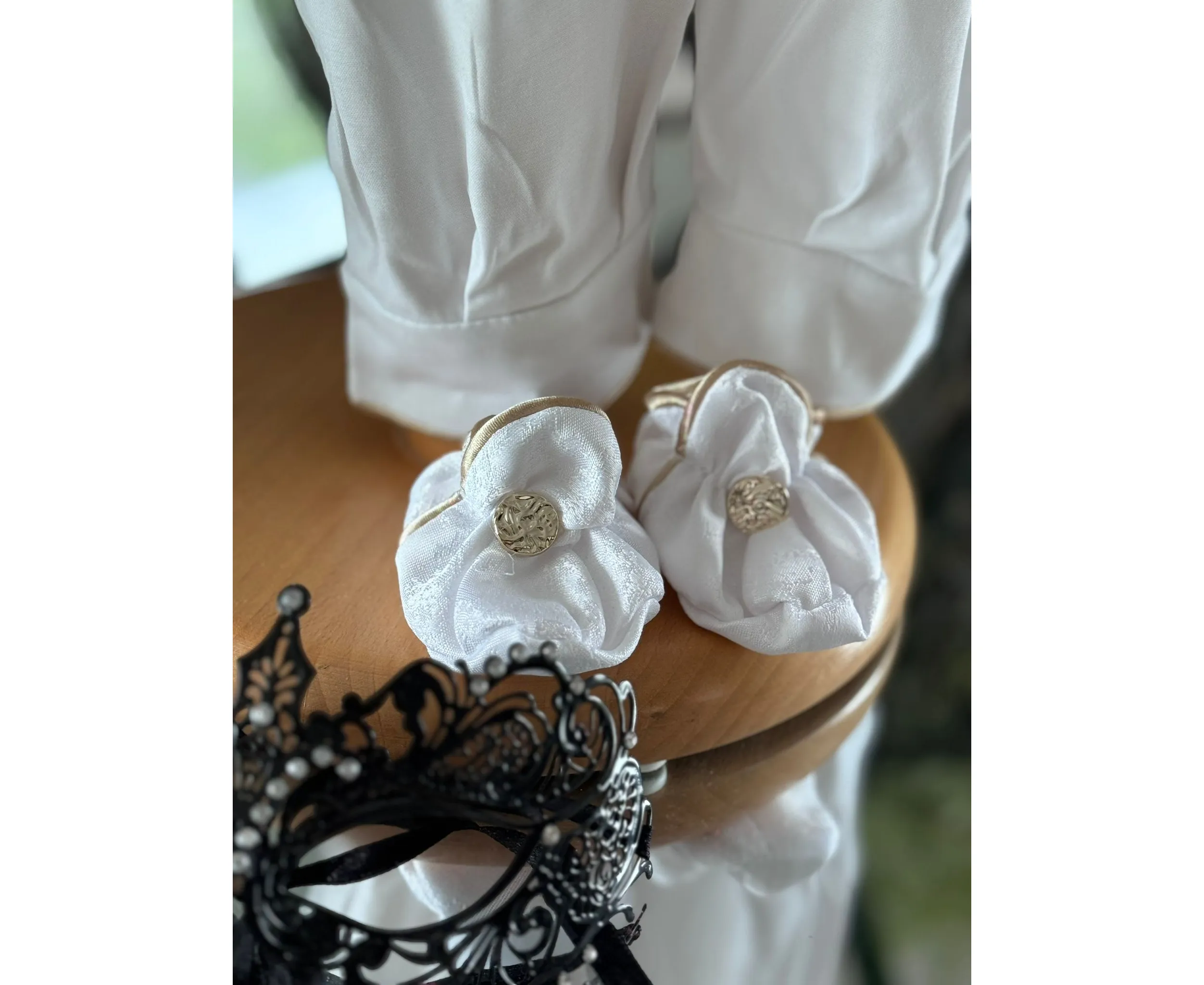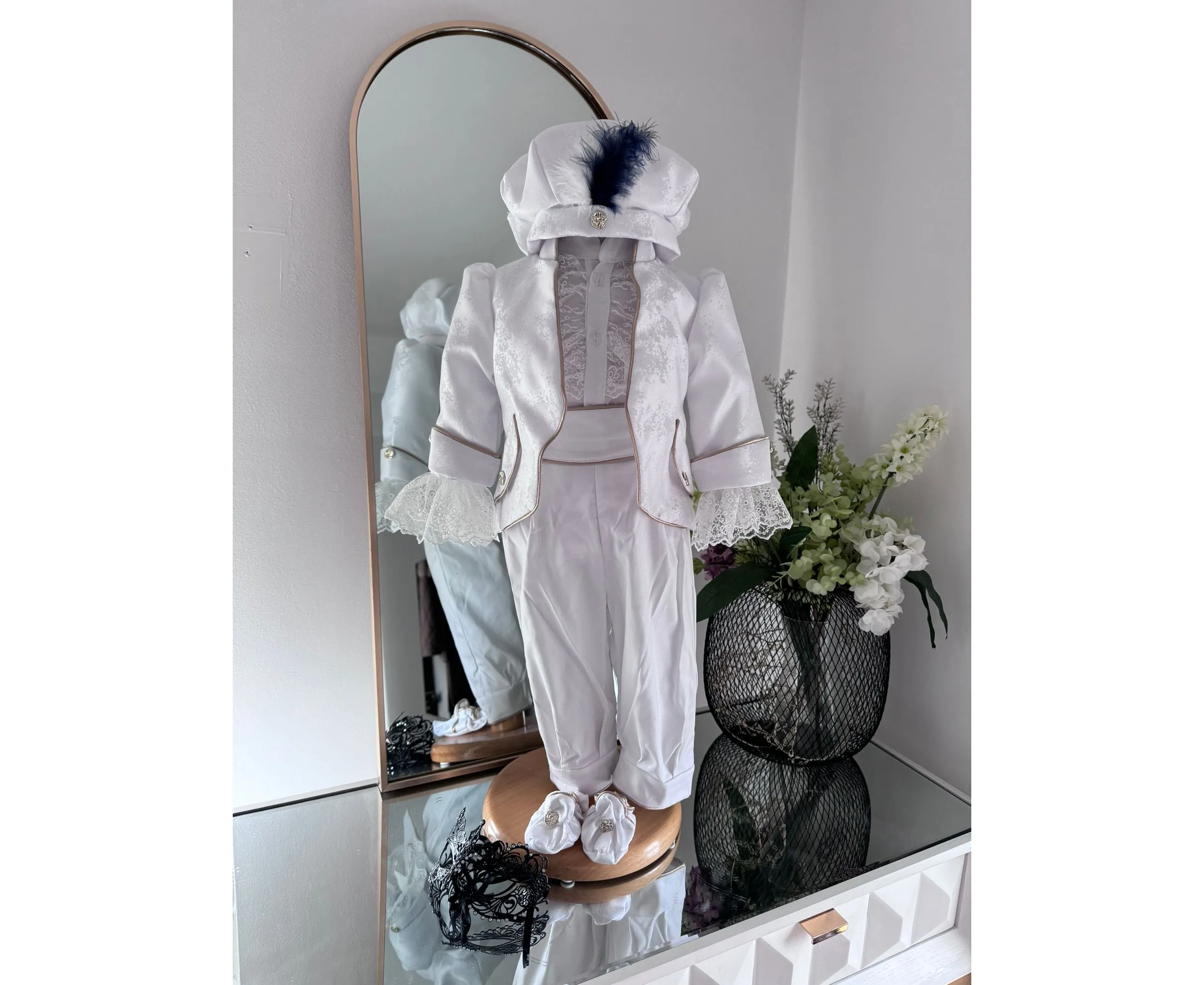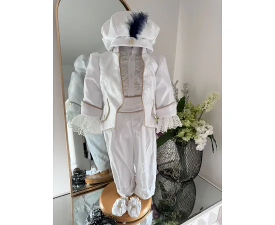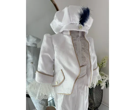 Costumul de botez pentru băieți este realizat cu grijă din materiale de calitate superioară, moi și delicate cu pielea sensibilă a bebelușului. Designul elegant îmbină rafinamentul clasic cu confortul absolut, fiind ideal pentru un eveniment special precum botezul